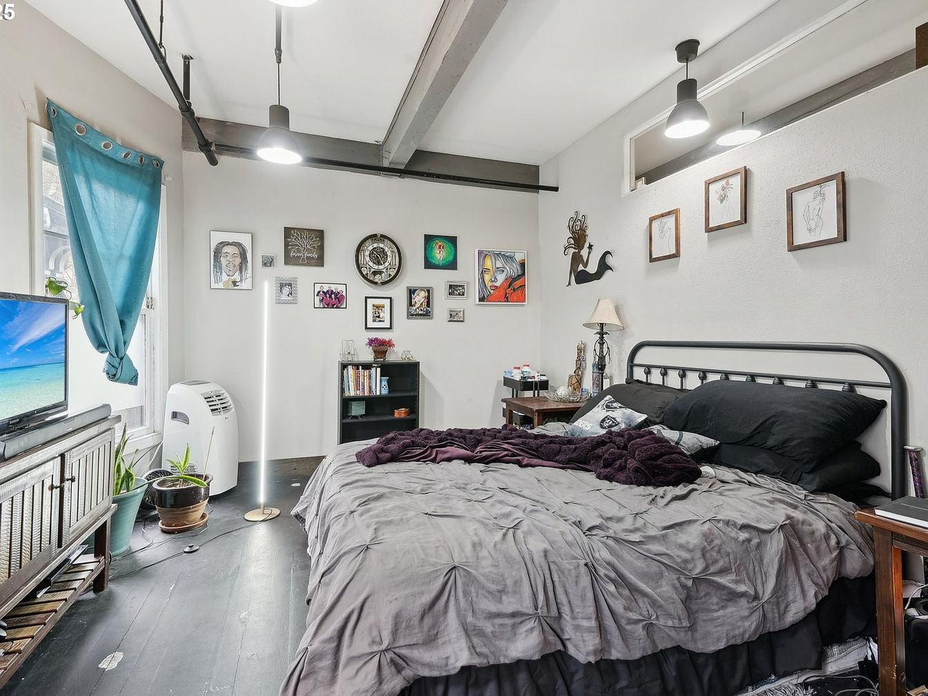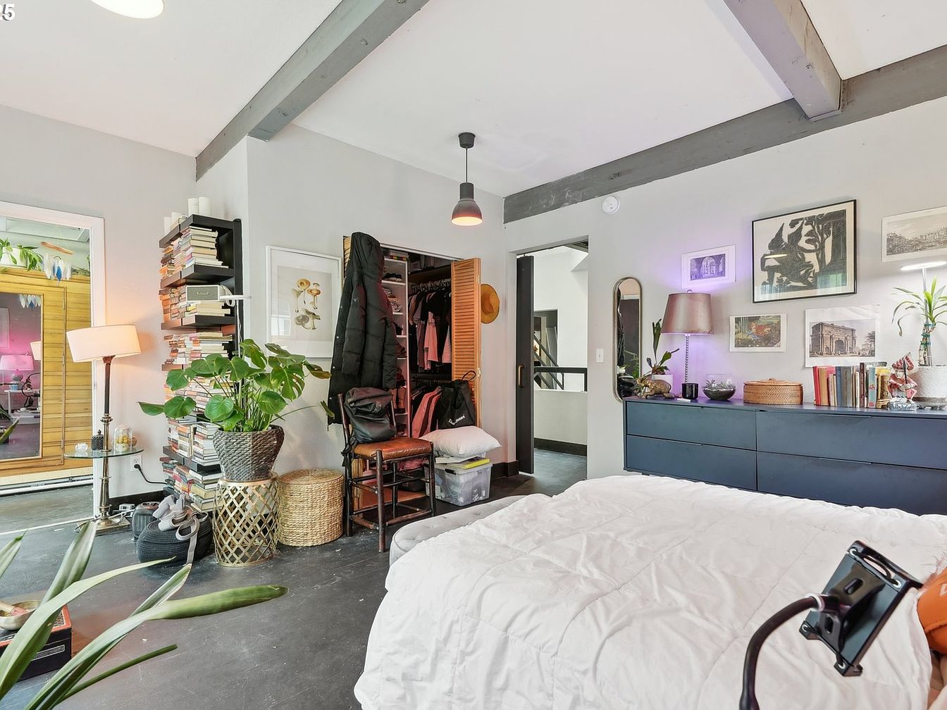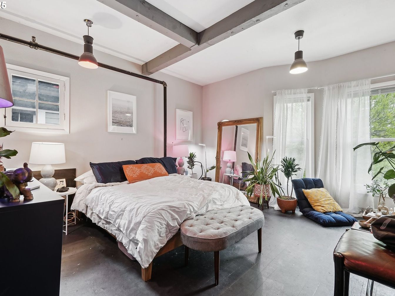 This master bedroom exudes a cozy, inviting atmosphere with its thoughtful layout and modern aesthetics. Featuring a spacious queen bed draped in soft linen, the room is anchored by an elegant velvet bench at its foot. A mix of plush textiles and subtle colors harmonizes, with gentle greens, whites, and earthy tones enhancing serenity. Wall-mounted artwork and curated décor create a personal touch, while ample natural light floods through bright windows. Structural beams lend an industrial charm, complemented by chic yet functional furnishings. The inclusion of greenery adds warmth, making this space both family-friendly and appealing.