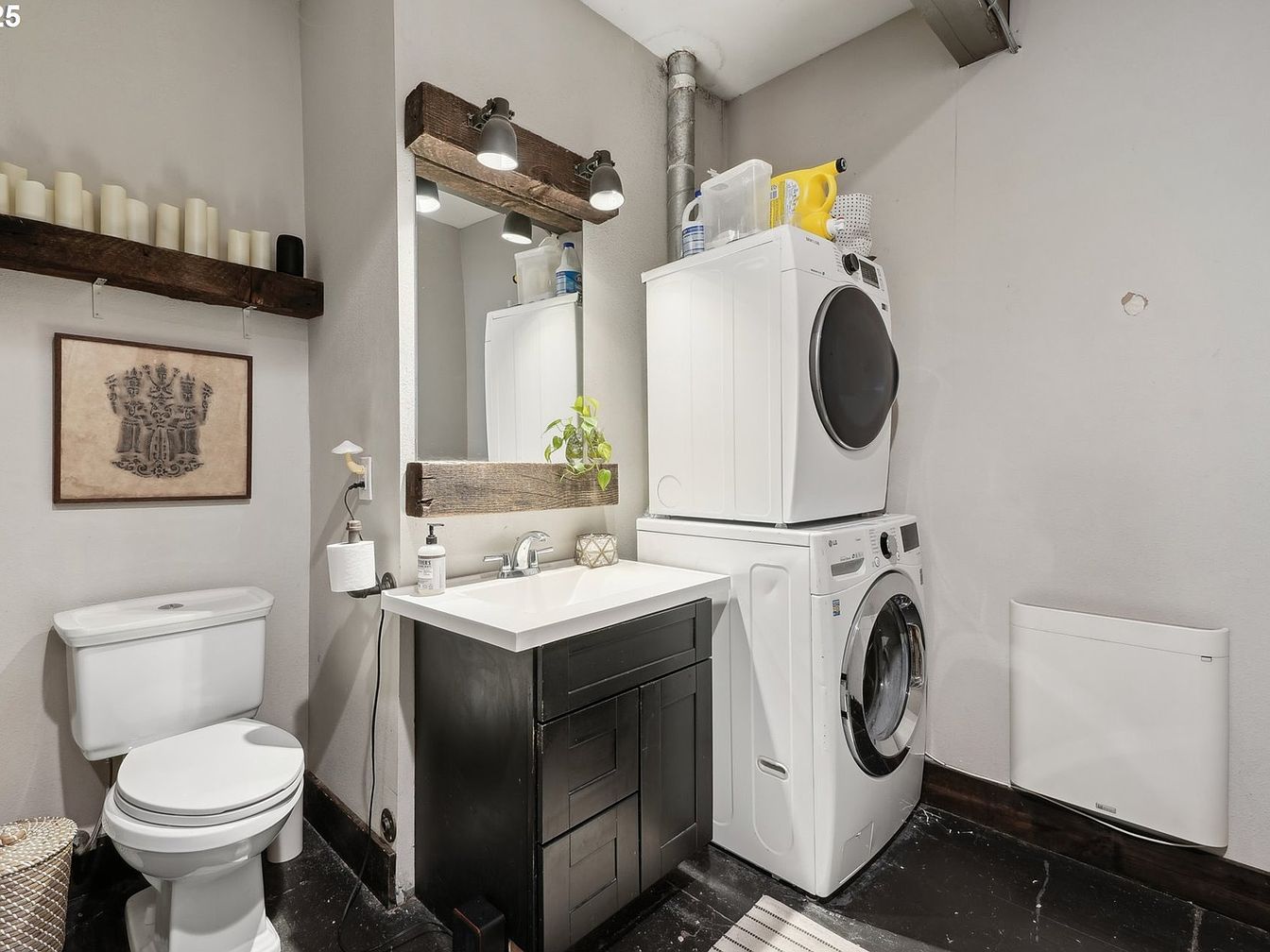 This cleverly designed laundry room features a seamless blend of functionality and style, ideal for busy households. A compact yet sleek washer and dryer are neatly stacked, maximizing space efficiency. The dark cabinetry contrasts beautifully with the light gray walls, while a rustic wood shelf adds warmth and charm, showcasing decorative candles. A modern, minimalistic sink complements the setup, ensuring convenience for quick chores. With a strategically placed mirror enhancing brightness and depth, the space feels larger. Family-friendly features like easy-access appliances and ample storage make this laundry area both practical and aesthetically pleasing.