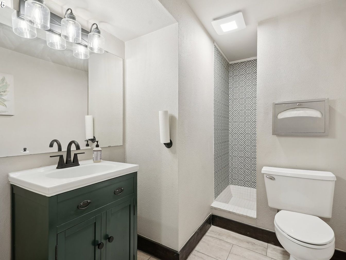 This elegant bathroom showcases a blend of contemporary aesthetics and functional design. The space features a sleek white countertop paired with a stylish dark green vanity, adding a pop of color against neutral gray walls. Illuminated by a chic five-bulb light fixture, the room is well-lit, enhancing the modern vibe. The shower area boasts an eye-catching geometric tile accent wall, providing visual interest. Comfort is emphasized with ample storage in the cabinetry, while the clean lines of the plumbing fixtures ensure a minimalist look. Overall, this bathroom is perfect for families seeking style and practicality.