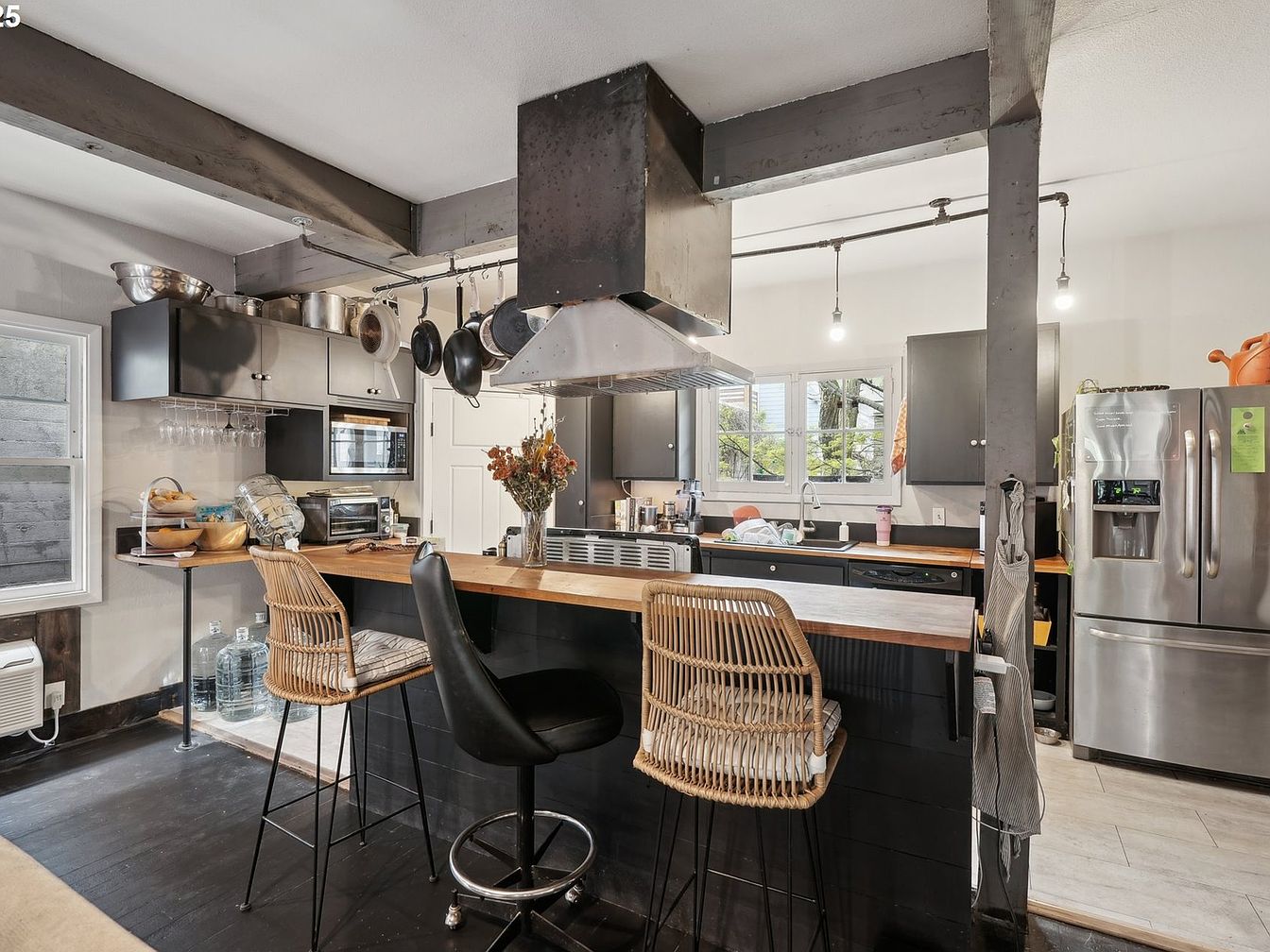 This modern kitchen exudes a warm, inviting atmosphere with a blend of functionality and style. The open layout encourages family interaction, featuring a large, island bar with rich wooden countertops that contrast beautifully with sleek black cabinetry. The stainless steel appliances add a contemporary touch, while the overhead pot rack showcases culinary tools for easy access. Exposed wooden beams and industrial-style lighting enhance the charm, creating a cozy yet sophisticated vibe. The large windows flood the space with natural light, seamlessly connecting to the dining area, promoting togetherness during meals and gatherings.