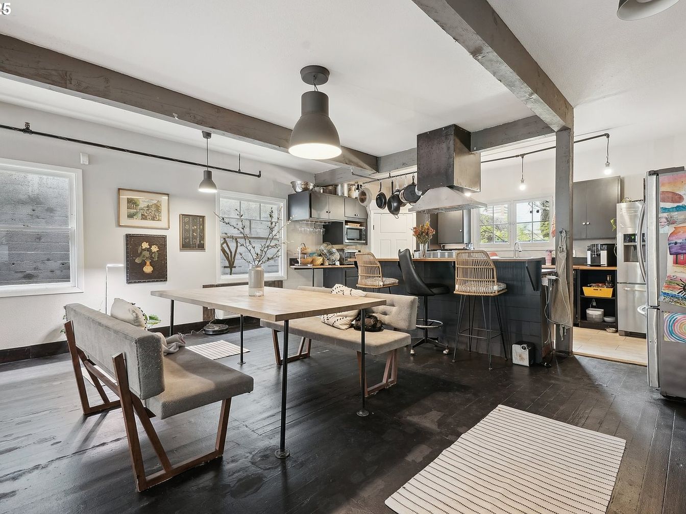 This open concept living area highlights a seamless connection between spaces, ideal for family interactions. Exposed wooden beams soar above, enhancing the airy atmosphere. The inviting black bar counter serves as a gathering point, complemented by rustic furniture, including a wooden dining table topped with cozy seating. A soothing palette of soft grays and earthy tones warms the room, while strategically placed artwork and greenery bring life and personality. The large windows flood the area with natural light, accentuating the rich hardwood flooring and creating a welcoming, family-friendly environment perfect for relaxation and entertaining.