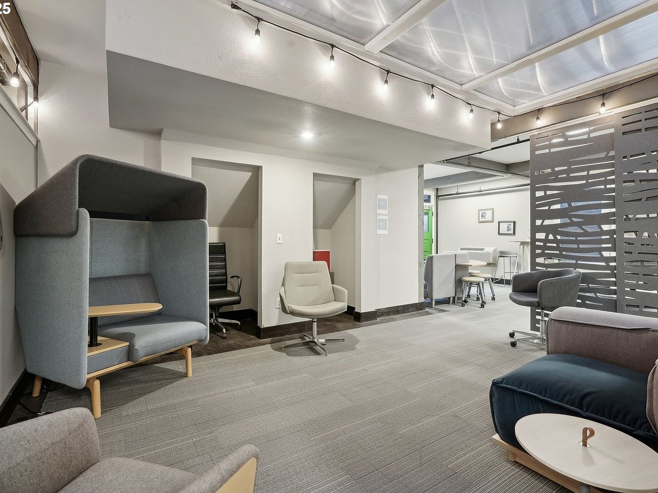 This inviting lounge area combines modern design with comfort, featuring a diverse range of seating options. Soft, muted tones dominate the color scheme, complemented by stylish furniture crafted from quality materials. The plush, gray upholstered chairs and compact work booths sit atop a textured area rug, enhancing the cozy vibe. A sleek, modern partition adds a creative touch while maintaining an open feel, ensuring the space is perfect for relaxation or casual meetings. Ambient lighting from stylish string lights creates a warm atmosphere, making this multifunctional area ideal for family gatherings or quiet evenings at home.