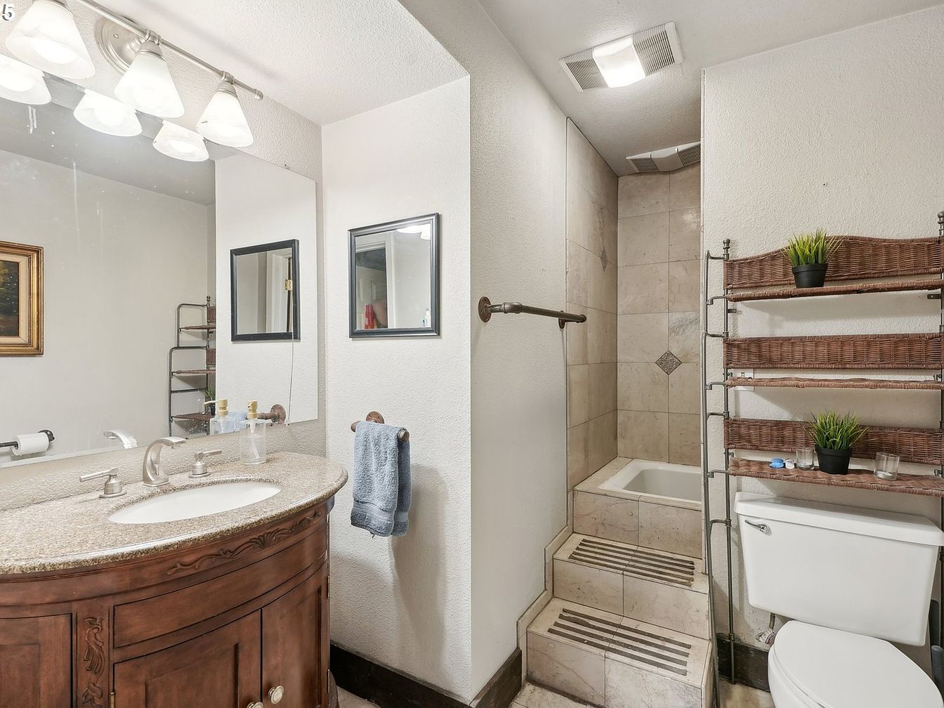 This stylish bathroom encapsulates contemporary elegance with its thoughtful layout and design elements. A spacious, walk-in shower with sleek glass panels features a striking contrast of textured tiles, enhanced by black and white mosaic flooring. The dark cabinetry beneath the minimalist sink provides ample storage, while a rustic wooden shelf above the sink adds warmth and character. Neutral tones throughout the space, complemented by modern lighting fixtures, create a serene ambiance. Ideal for families, the open design allows for ease of movement, while decorative details offer a chic yet functional feel, perfect for daily routines.