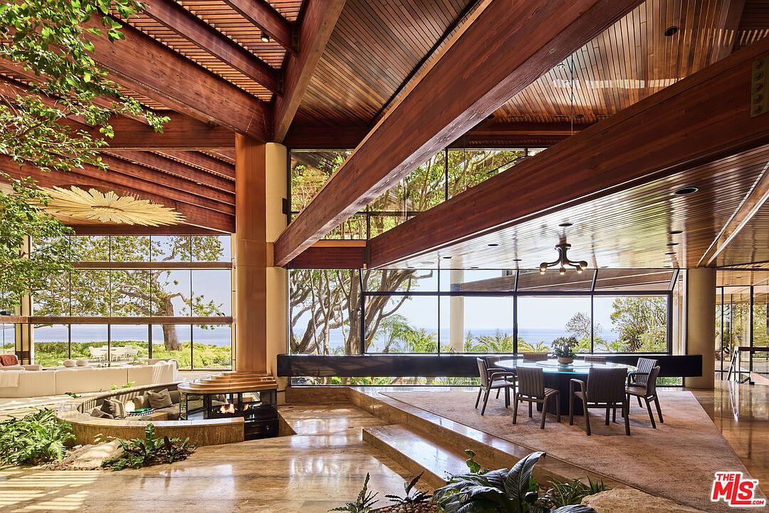 This open concept living area highlights a seamless connection between spaces, ideal for family interactions. Exposed wooden beams soar above, enhancing the airy atmosphere. The inviting black bar counter serves as a gathering point, complemented by rustic furniture, including a wooden dining table topped with cozy seating. A soothing palette of soft grays and earthy tones warms the room, while strategically placed artwork and greenery bring life and personality. The large windows flood the area with natural light, accentuating the rich hardwood flooring and creating a welcoming, family-friendly environment perfect for relaxation and entertaining.