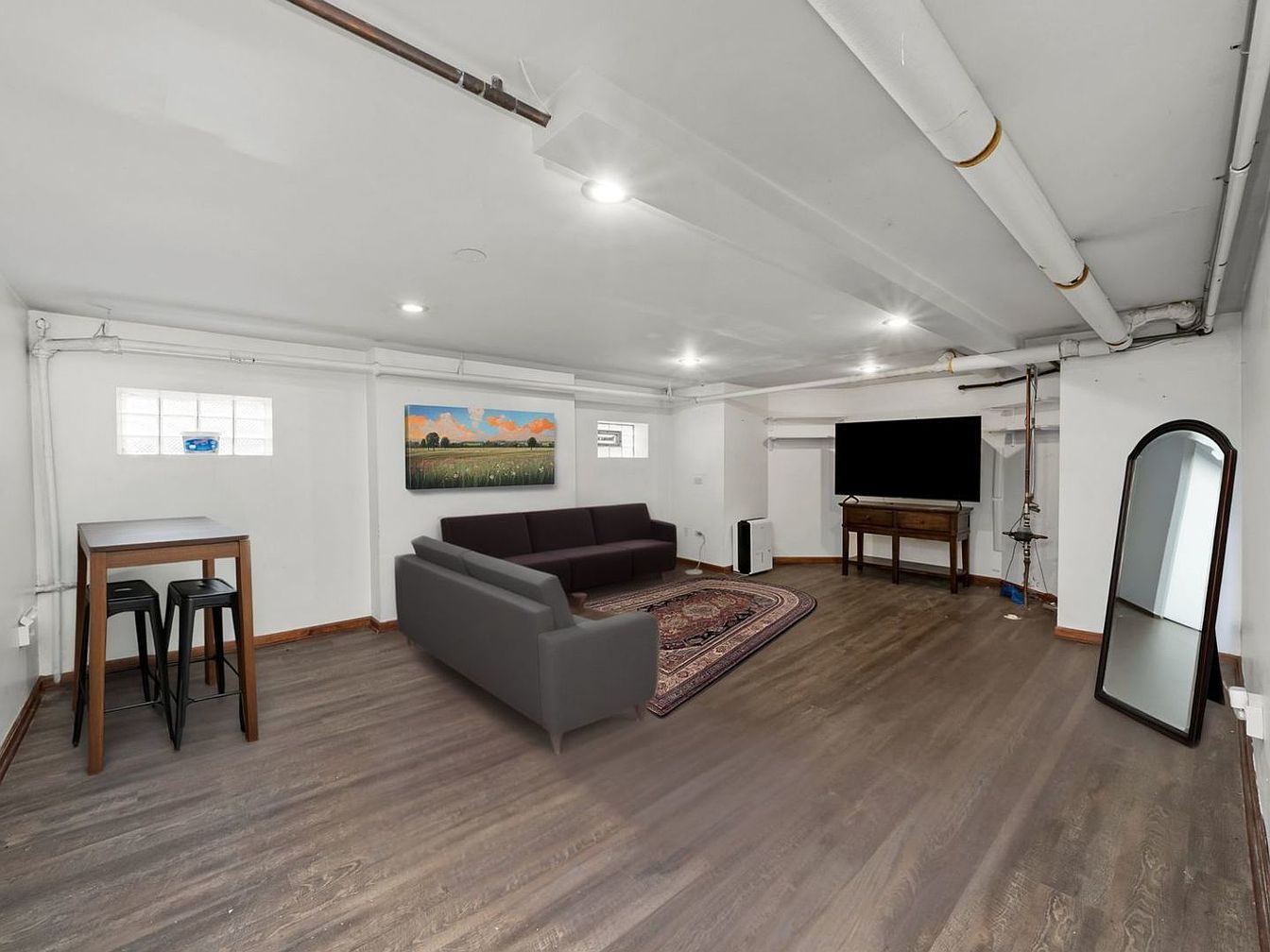 Spacious and versatile, this basement family room boasts an open layout, ideal for both relaxing and entertaining. The room features durable wood-like flooring perfect for family activities, while recessed lighting brightens the area. A comfortable sectional sofa is centered around a patterned area rug, providing a cozy spot for movie nights or gatherings, complemented by a large wall-mounted TV. A corner table with stools offers a space for games or homework. The neutral white walls and exposed piping add a touch of modern industrial charm. Large mirrors and artwork inject personality, making this a welcoming multi-purpose retreat for all ages.