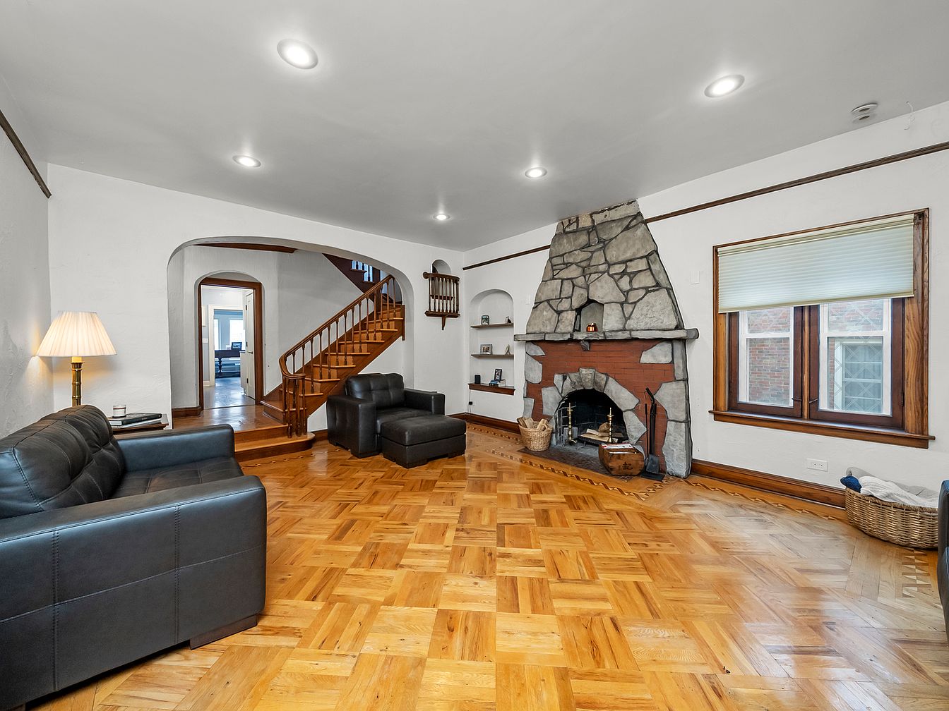 This inviting living room highlights a striking stone fireplace as the focal point, flanked by built-in shelving ideal for displaying family mementos or books. The rich parquet hardwood floors impart warmth while the wood trim around windows and arches adds a touch of classic American craftsmanship. Black leather sofas offer durable, family-friendly seating and the open layout leads naturally into the rest of the home, including a beautiful wood staircase. Abundant natural light streams through large windows, creating a bright, comfortable atmosphere perfect for gatherings or quiet evenings by the fire. Subtle recessed lighting keeps the space well-lit and modern.