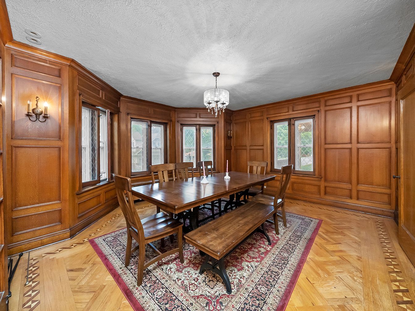 Rich wood paneling wraps the space in warmth, creating a cozy yet elegant atmosphere for family gatherings. The long rectangular dining table, flanked by classic wooden chairs and a bench, encourages shared meals and conversation for larger groups or families. Large bay windows with diamond-patterned glass bring in natural light and charming views, while a traditional chandelier overhead adds a touch of sophistication. A patterned area rug defines the dining area, complementing the herringbone wood floors with intricate inlay detailing. Sconces on the walls and the open uncluttered layout make this room inviting for both formal dinners and casual family time.