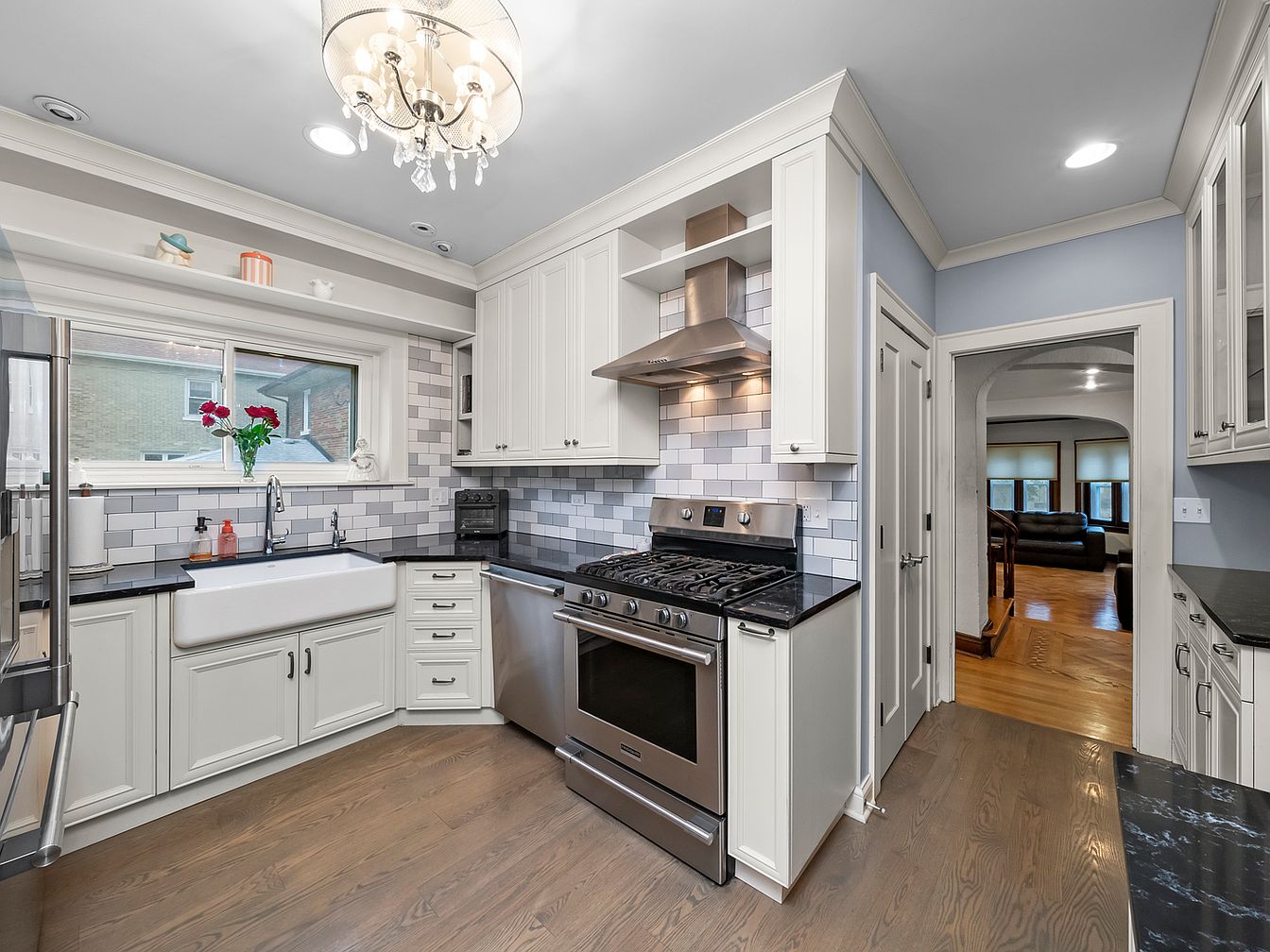 A bright and inviting kitchen features white cabinetry, sleek black countertops, and a charming farmhouse sink centered beneath a large window that brings in generous natural light. Soft blue-gray walls and a classic subway tile backsplash in varying shades of gray add depth and warmth. Stainless steel appliances, including a modern range and dishwasher, complement the timeless aesthetic. Plenty of storage space, easy-to-clean hardwood floors, and open sightlines to adjacent family spaces make this kitchen both practical for busy family life and perfect for hosting. Elegant touches like the crystal chandelier enhance the overall contemporary yet cozy vibe.