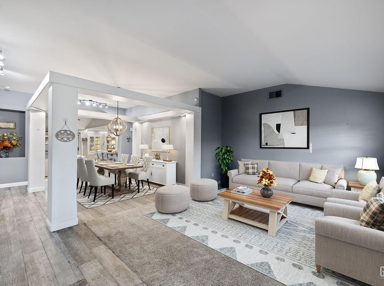 A spacious open-plan living and dining area beautifully blends modern comfort with family-friendly functionality. Soft gray walls highlight the bright, airy atmosphere, while plush neutral sofas and comfy lounge chairs provide inviting seating for gatherings. The living area’s light wood coffee table sits atop a patterned rug, complemented by soft ottomans ideal for children or extra guests. The adjacent dining space features a contemporary wood table, tufted cream chairs, and striking pendant lighting, making it perfect for family meals and entertaining. Subtle décor, framed artwork, and warm lamps throughout the space enhance its cozy, welcoming ambiance.