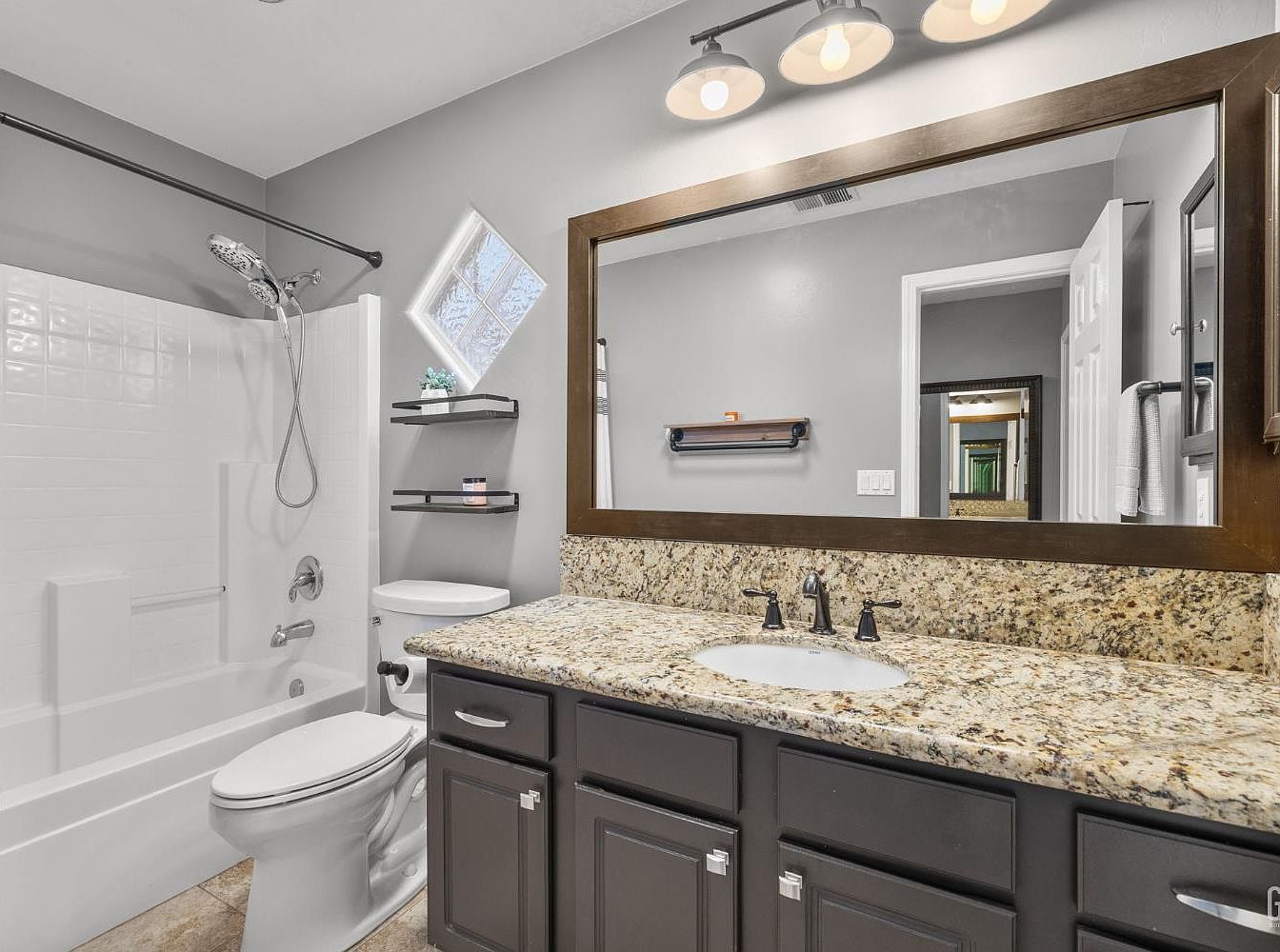This bathroom combines functionality with modern elegance, featuring a spacious granite countertop atop dark wood cabinetry with ample storage for family essentials. The light gray walls and large mirror enhance the room’s brightness, complemented by industrial-style triple lighting. The built-in bathtub/shower combo is practical and safe for both children and adults, with a handheld showerhead for versatility. Floating shelves above the toilet offer extra space for toiletries or decorative touches. A diamond-shaped window adds architectural interest and natural light, making the space inviting and easy to maintain, ideal for family-friendly daily routines.