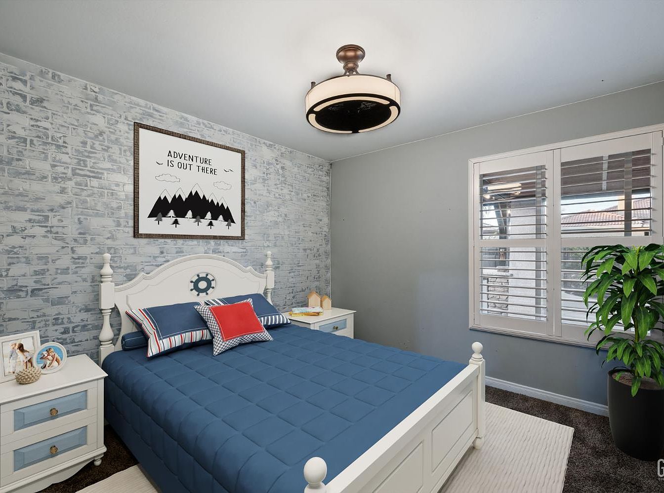 A cozy kid’s bedroom featuring a delightful blend of comfort and playful charm. The room showcases a nautical-themed bed with crisp white frame and rich blue bedding, accented by colorful throw pillows. The feature wall, styled with a whitewashed brick pattern and a whimsical adventure-themed print, adds a sense of creativity and inspiration. Dual nightstands, holding books and family photos, create a homely touch, while a large window with plantation shutters floods the space with natural light. A soft area rug, plush carpeting, and lush green plant complete this cheerful, family-friendly retreat ideal for imaginative play and restful nights.