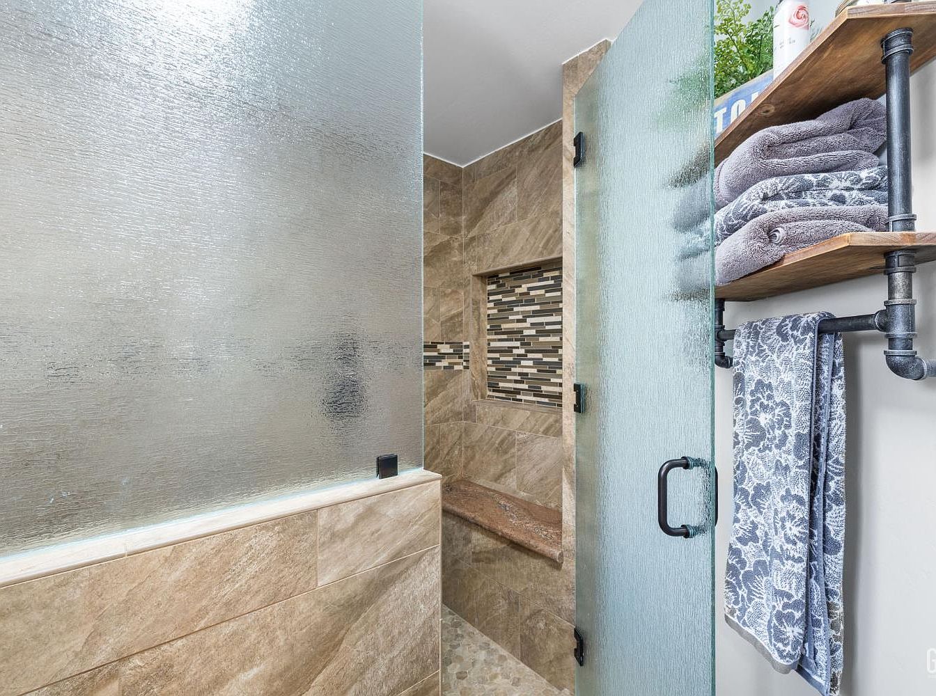 A modern walk-in shower designed with family comfort in mind features frosted glass doors for privacy and textured beige stone tiles that extend up the walls and across the built-in bench, providing both utility and visual warmth. A mosaic tile accent adds stylish flair to the recessed shower niche, ideal for storing toiletries within easy reach. Open industrial pipe shelving, stacked with plush towels and decor, complements the neutral palette and offers accessible storage, functional for busy households. The natural tones and thoughtfully designed layout create a spa-inspired, kid-friendly bathing space that remains elegantly contemporary.