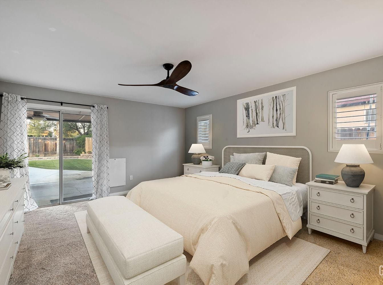 A spacious master bedroom blends comfort and style, featuring a neutral palette of taupe, cream, and gray tones that enhance the tranquil atmosphere. Large sliding glass doors fill the room with natural light and offer easy access to a private backyard, ideal for family gatherings or children playing safely outside. Soft carpeting underfoot adds warmth, while the bed is accented with layered pillows and a cozy comforter. Two matching nightstands and table lamps provide practical lighting, and a padded bench at the foot of the bed offers extra seating or storage. Thoughtful details create a welcoming, family-friendly space.