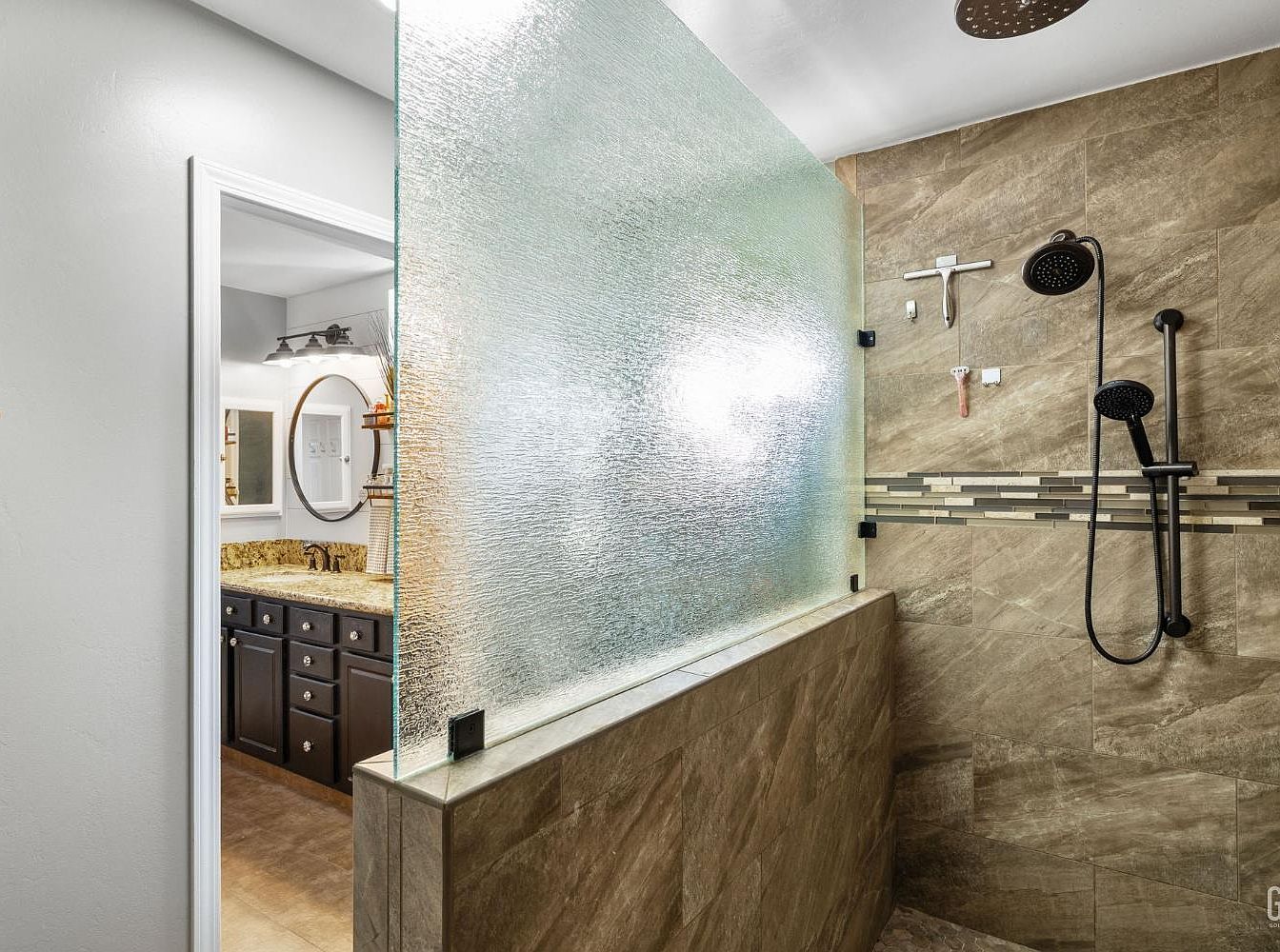 An inviting walk-in shower showcases contemporary design with a seamless glass partition, offering privacy while maintaining an open and airy feel. Earth-toned tiles create a calming natural palette that’s both timeless and family-friendly, providing a non-slip surface for safety. The handheld shower and rainfall head are practical for users of all ages, making bath time simple for little ones or easy for adults. Just beyond, a granite-topped vanity with dark cabinetry and a softly lit mirror adds sophistication and storage. This bathroom blends function and style, making it a comfortable retreat for daily routines.