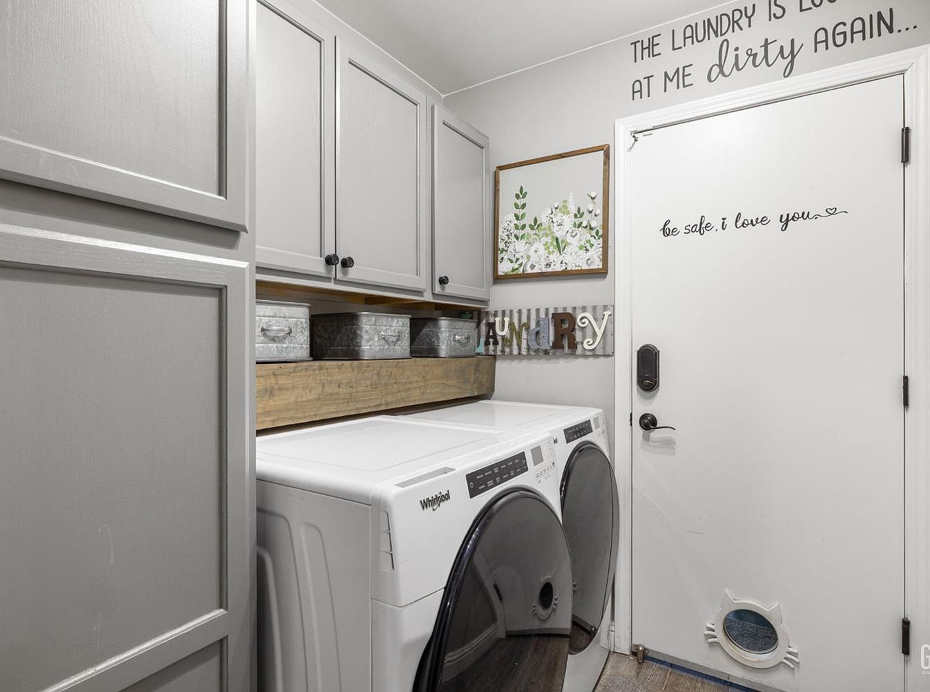 A practical and inviting laundry room features sleek, light gray cabinetry that offers ample storage above a matching washer and dryer set. The neutral palette is brightened with white walls and playful decor, including a whimsical wall quote and floral artwork. Galvanized bins neatly arranged on a wooden shelf add easy-access organization for supplies, ideal for busy family routines. A cat door in the lower part of the entry highlights pet-friendly design, making this space functional for all members of the household. The compact layout is thoughtfully planned, ensuring everything needed for laundry is close at hand.