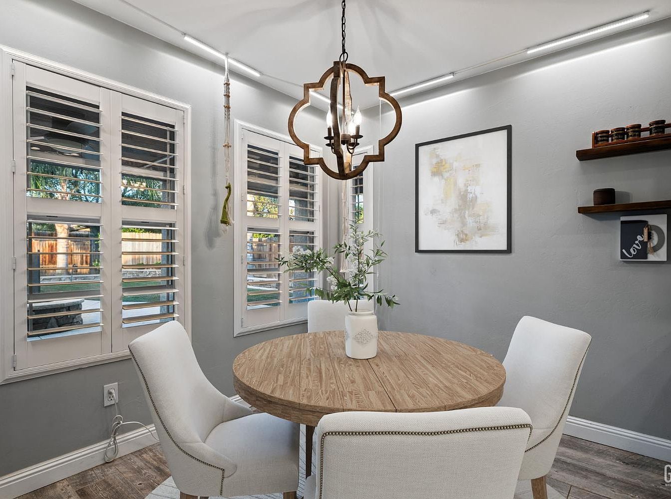 A bright breakfast nook offers a warm and inviting space perfect for family meals or casual gatherings. The round wooden table is surrounded by four comfortable, upholstered chairs in a soft ivory fabric, ideal for both children and adults. Large plantation shutters allow natural light to flood the room while providing privacy and views of the backyard. Soft gray walls complement the neutral color palette, accented by a modern abstract painting and minimalist floating shelves. The statement chandelier adds a touch of elegance, while easy-to-clean flooring and the compact layout ensure practicality for everyday living.