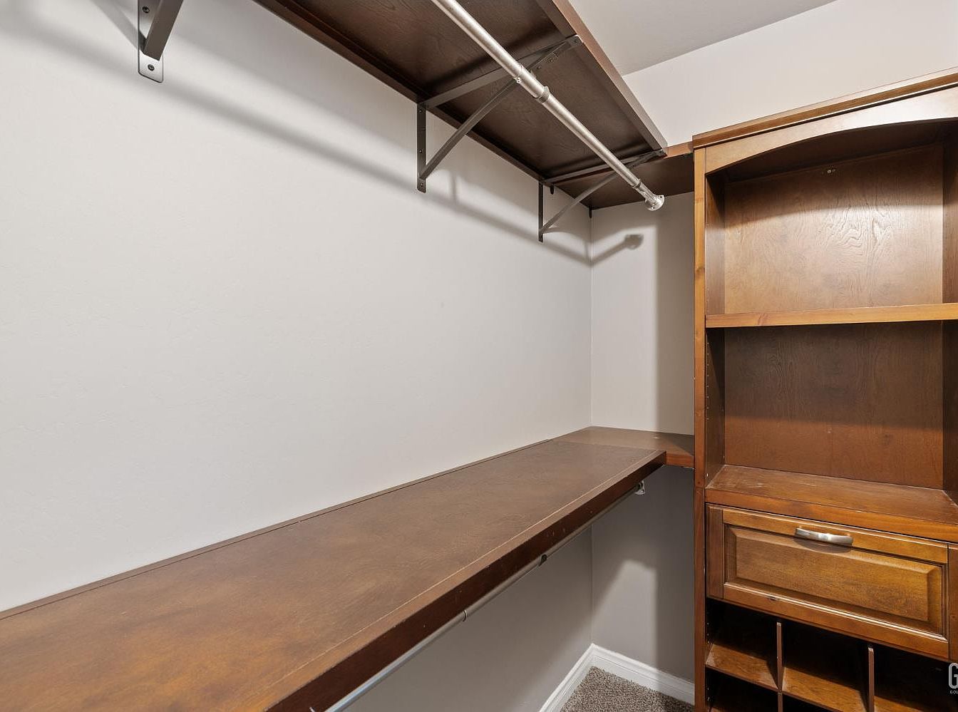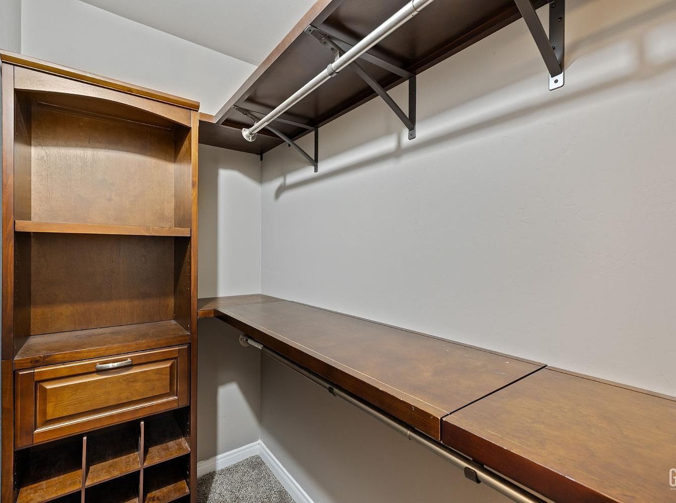 Spacious and thoughtfully designed, this walk-in closet features rich wooden shelving and ample hanging space, making it ideal for keeping a family’s wardrobe organized. The layout includes a long shelf and hanging rod for clothing, paired with built-in open shelves and drawers that maximize storage for shoes, accessories, and folded garments. The neutral wall color and plush carpeting create a clean, modern, and welcoming atmosphere. The cabinetry’s warm wood tones add a touch of elegance, ensuring the space feels both functional and stylish for everyday use, keeping clutter to a minimum and everything easily accessible for family members.