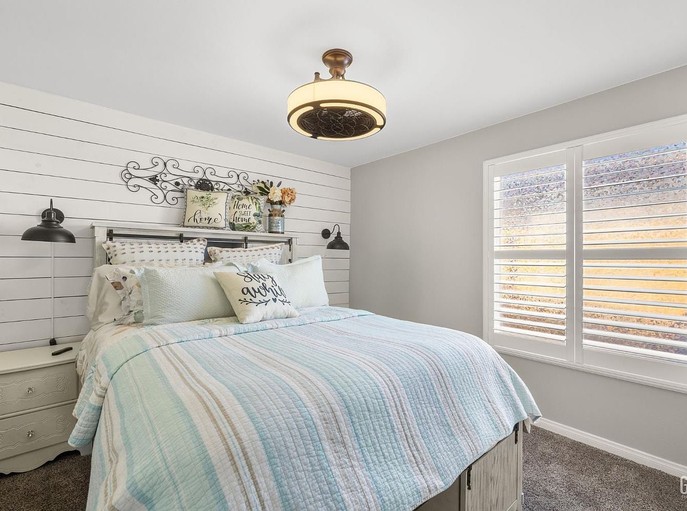 A charming farmhouse-inspired bedroom filled with soft light and gentle pastels. The crisp white shiplap accent wall adds character, while black sconces provide focused reading light over the bed. Plush bedding in soothing shades of aqua and sand creates a serene, family-friendly atmosphere ideal for relaxation. Thoughtful touches, like decorative pillows and uplifting wall art, add warmth and personality. Wide plantation shutters offer privacy and diffuse sunlight, making the space bright yet comfortable. The neutral carpet provides a cozy foundation, perfect for children or pets, and the overall layout feels open, welcoming, and thoughtfully designed for everyday living.