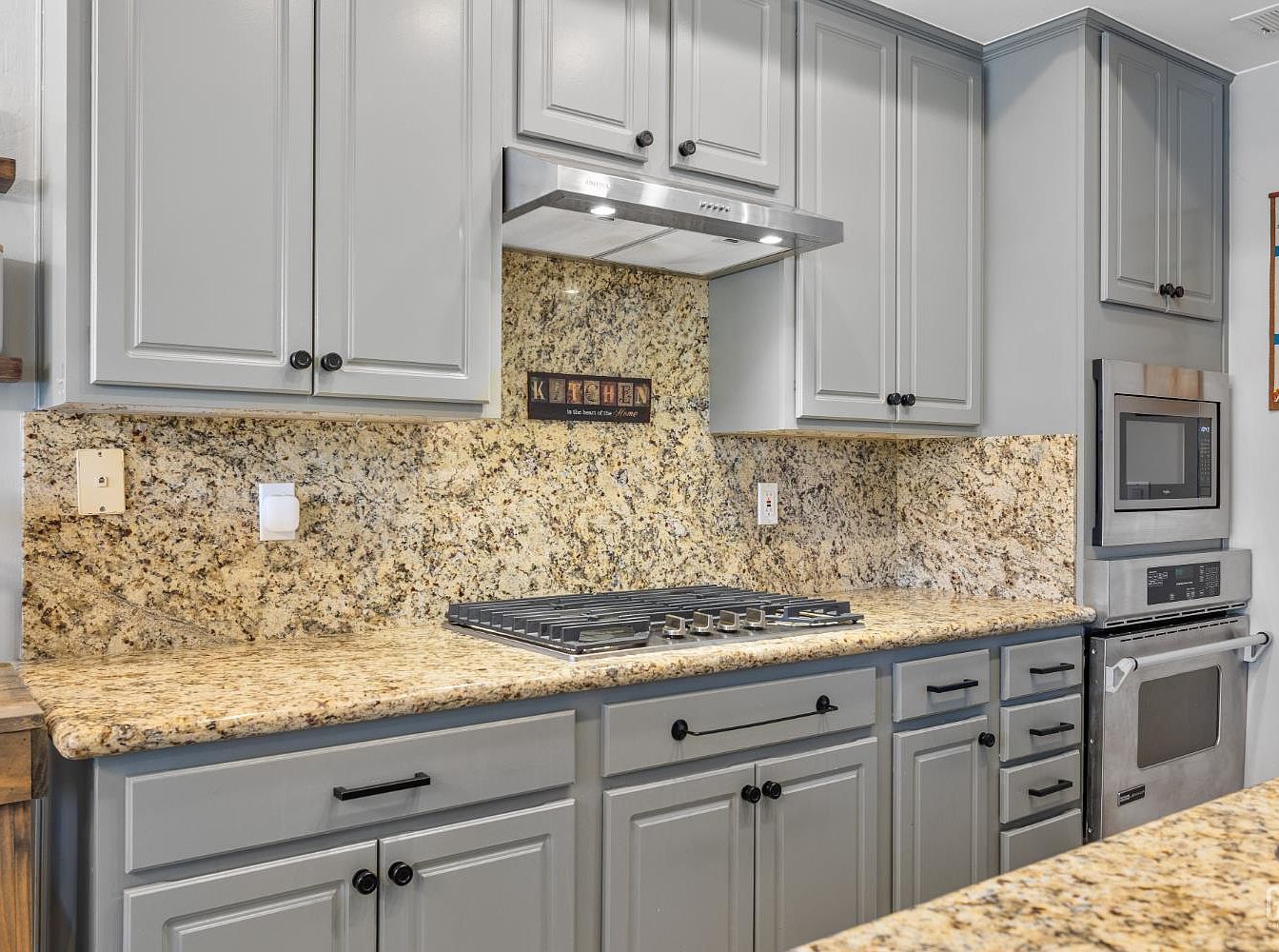 A welcoming and practical kitchen countertop features soft gray cabinetry with classic panel doors, paired with coordinating black handles for a modern touch. The countertop and full backsplash shine in warm, speckled granite, offering both durability and elegant style, perfect for family meals and gatherings. Stainless steel appliances, including a built-in microwave, oven, and a sleek gas cooktop under a minimalist hood, underscore the contemporary yet inviting feel. The neutral color palette, ample storage, and easy-to-clean surfaces make this space ideal for families, ensuring a balance of efficient workflow and homey comfort for everyday living.