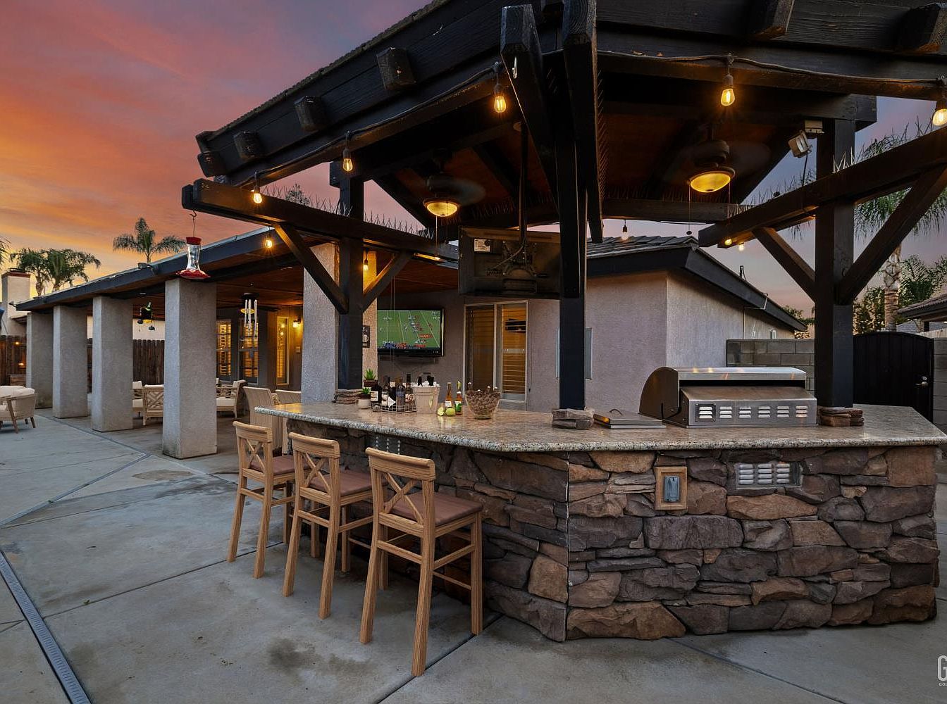 This inviting outdoor kitchen bar combines rustic charm with modern amenities, creating a perfect setting for gatherings and family entertainment. The spacious stone-topped counter wraps around a built-in grill and prep area, complemented by four natural wood barstools for comfortable seating. Exposed beams and string lighting under the pergola provide warmth and ambiance, while the attached TV ensures entertainment for all. The surrounding concrete patio offers ample room for movement and play, making it ideal for children and adults alike. Neutral tones in the masonry and stucco harmonize with the sunset backdrop, blending relaxation and sophistication seamlessly.