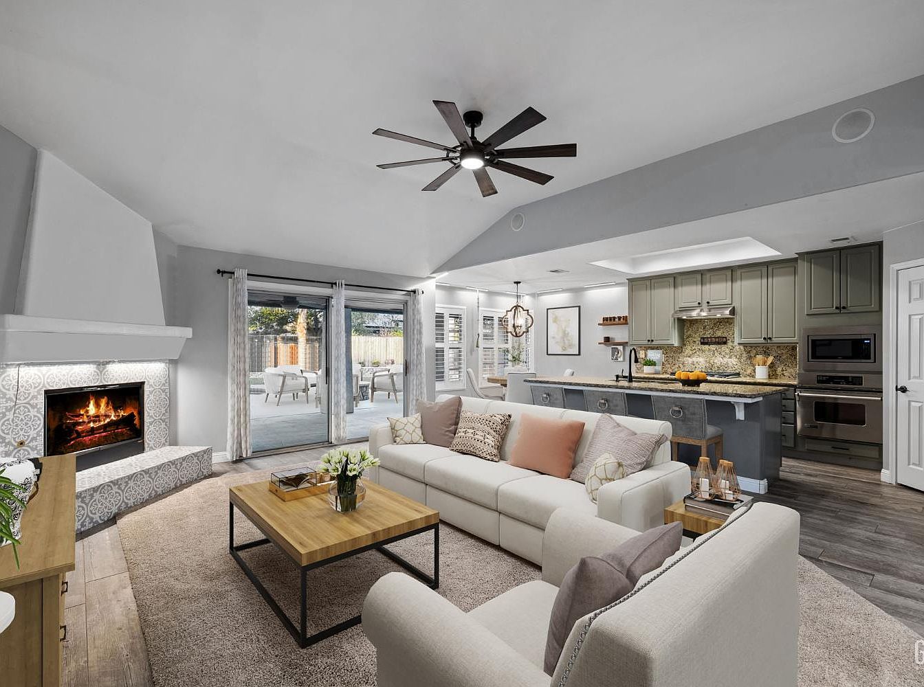 A spacious open-concept living area seamlessly connects the cozy living room, modern kitchen, and casual dining space, making it ideal for family gatherings and everyday life. Neutral colors and warm wood elements create a welcoming atmosphere, while a plush sectional with soft pillows ensures ample and comfortable seating. The tiled fireplace adds a touch of elegance, anchoring the room and providing a focal point. Large sliding glass doors flood the room with natural light and offer easy access to an inviting backyard patio, perfect for children and entertaining. Stylish cabinetry, stone countertops, and stainless appliances highlight the kitchen’s contemporary yet homey vibe.