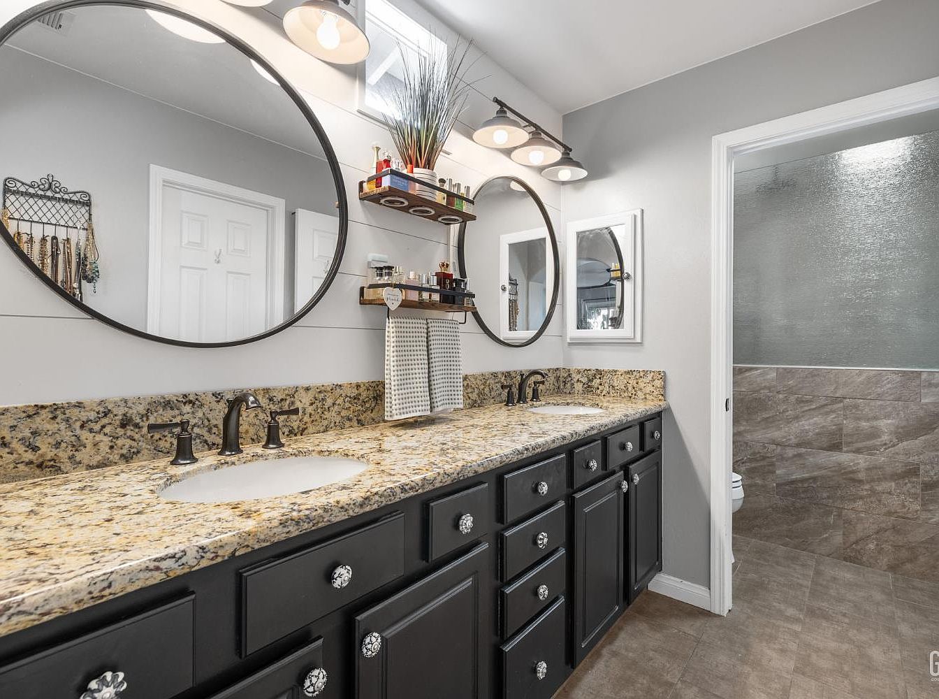 This bathroom features a spacious double vanity with elegant, speckled granite countertops and stylish black cabinetry, adding a modern yet timeless touch to the space. Two large round mirrors and overhead lighting ensure ample brightness and functionality for busy mornings. The color palette is neutral with soft gray walls and tan floor tiles, creating a calming environment. Family-friendly elements include dual sinks for convenience, abundant storage in the cabinetry, and neatly organized shelves for daily essentials. The adjacent shower area, defined by glass and partial tile wall, enhances privacy while maintaining an open, airy layout for shared use.