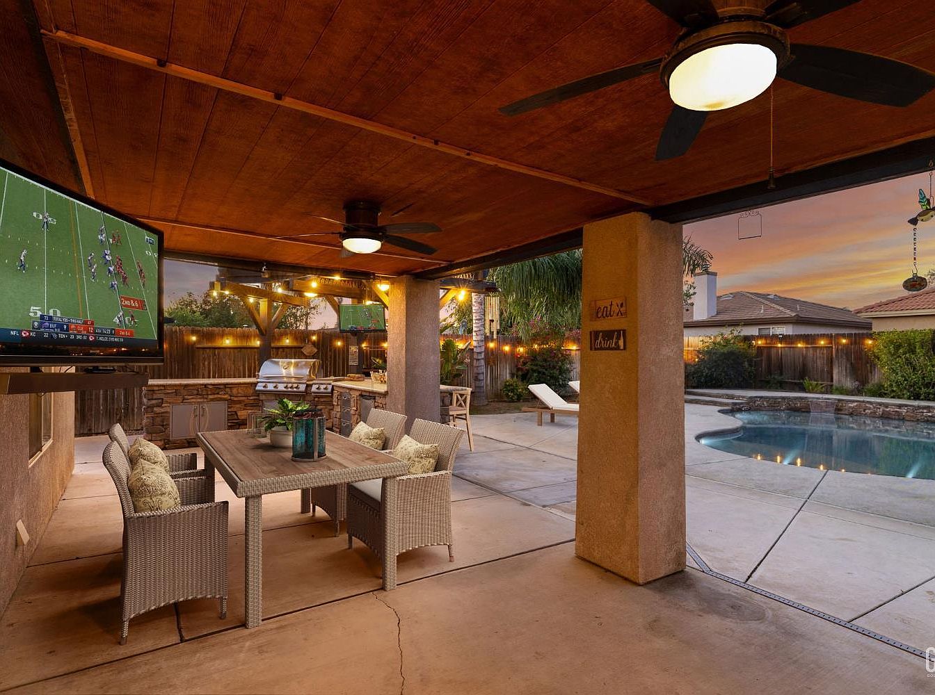A spacious covered patio seamlessly blends comfort and function, perfect for family gatherings and lively entertainment. The area features cozy wicker chairs surrounding a rustic dining table, all under the warmth of wood panel ceilings with modern ceiling fans for a cooling breeze. A mounted TV invites sports nights, while the built-in stone grill and prep area make outdoor cooking easy and sociable. Warm string lights and lush landscaping create an inviting atmosphere, enhanced by a sparkling pool and sun loungers just steps away. The earthy neutral color palette and durable materials ensure lasting style and family-friendly appeal.
