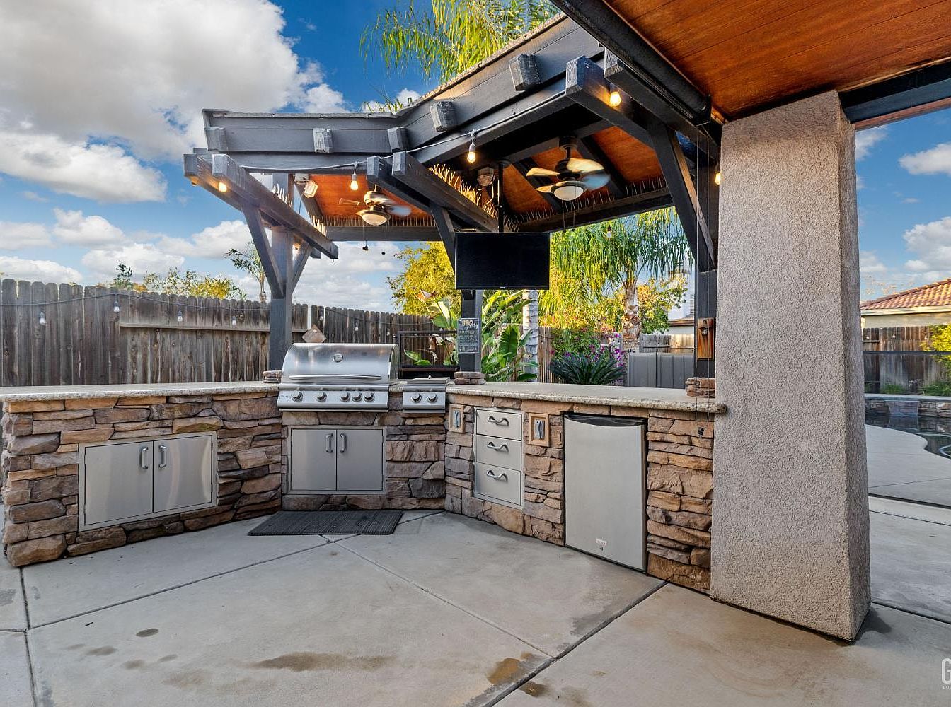 This inviting outdoor kitchen area features a built-in grill, mini refrigerator, and ample stone-faced cabinetry, all set beneath a stylish wood and beam pavilion with modern ceiling fans and accent lighting. The neutral stonework and brushed steel appliances complement the natural setting, offering a warm yet contemporary aesthetic. Designed for entertaining, the spacious counter provides a gathering spot for family and friends, while the sheltered space ensures comfort in any weather. The open layout connects beautifully to the backyard, making this an ideal, family-friendly retreat for summer barbecues and poolside dining. Lush palm trees and privacy fencing add a relaxing, resort-like atmosphere.