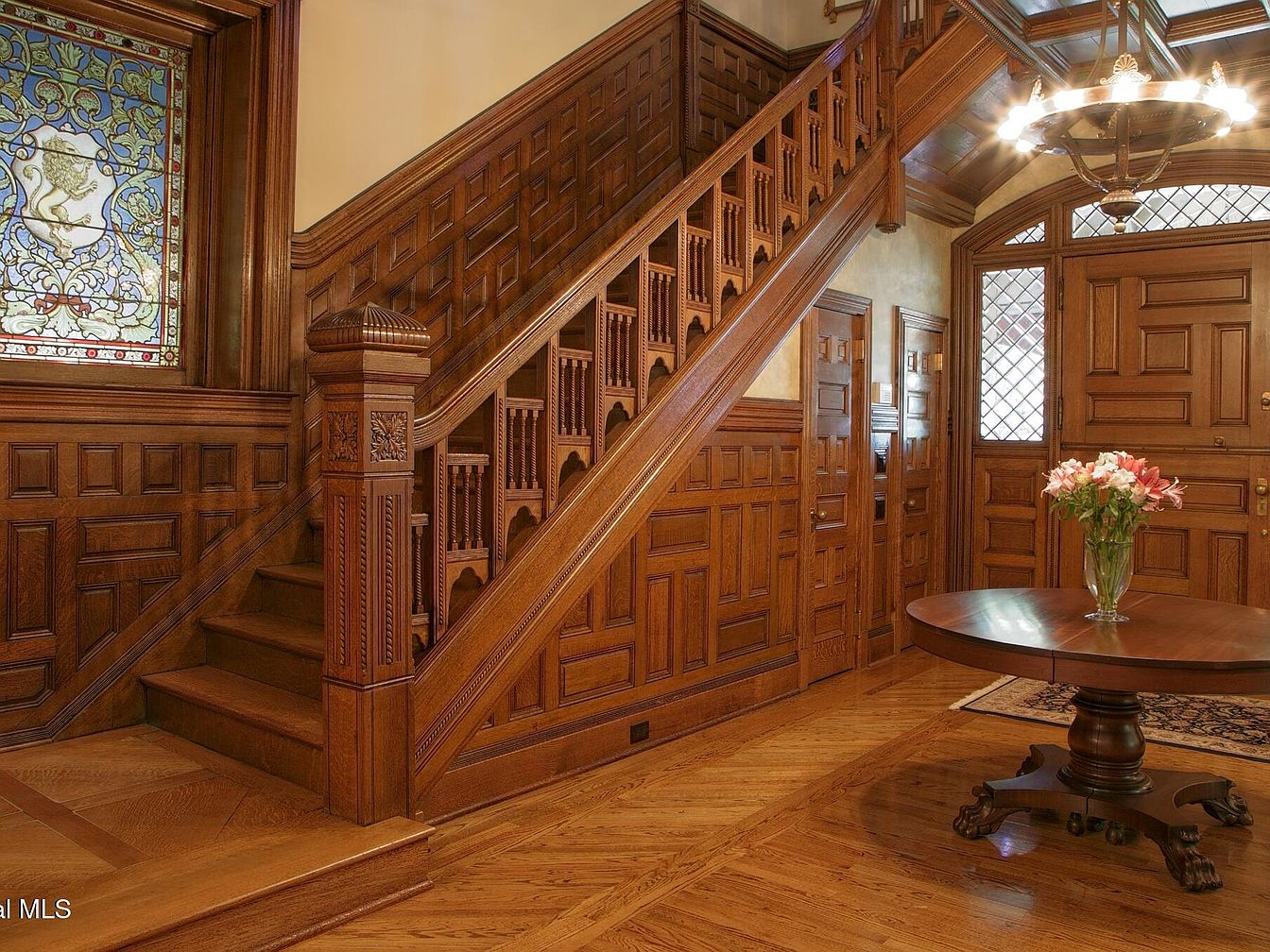 This elegant entryway welcomes guests with intricately carved wood paneling and a grand staircase that exudes timeless craftsmanship. The gleaming hardwood floors pair harmoniously with the warm, honey-toned walls and dark wood trim, creating a cozy yet sophisticated atmosphere. A stained glass window bathes the space in colorful light, serving as a striking focal point. The round table topped with fresh flowers on a classic area rug adds an inviting touch, making the area family friendly while maintaining its formal charm. Soft overhead lighting from a chandelier enhances the architectural details, perfect for greeting visitors.