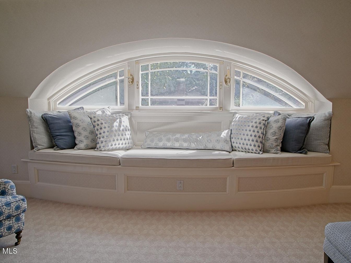 This charming window seat nook creates a cozy retreat perfect for reading, lounging, or daydreaming. Set beneath a striking arched window, the space is bathed in natural light, making it bright and inviting for all ages. Plush seat cushions and an array of patterned throw pillows in soft blue and ivory tones add comfort and style. The classic paneled woodwork and subtle textured wallpaper are timeless, blending seamlessly with the neutral carpeting. Family-friendly and welcoming, this nook offers a serene atmosphere, encouraging relaxation and togetherness while making the most of the home’s architectural details.