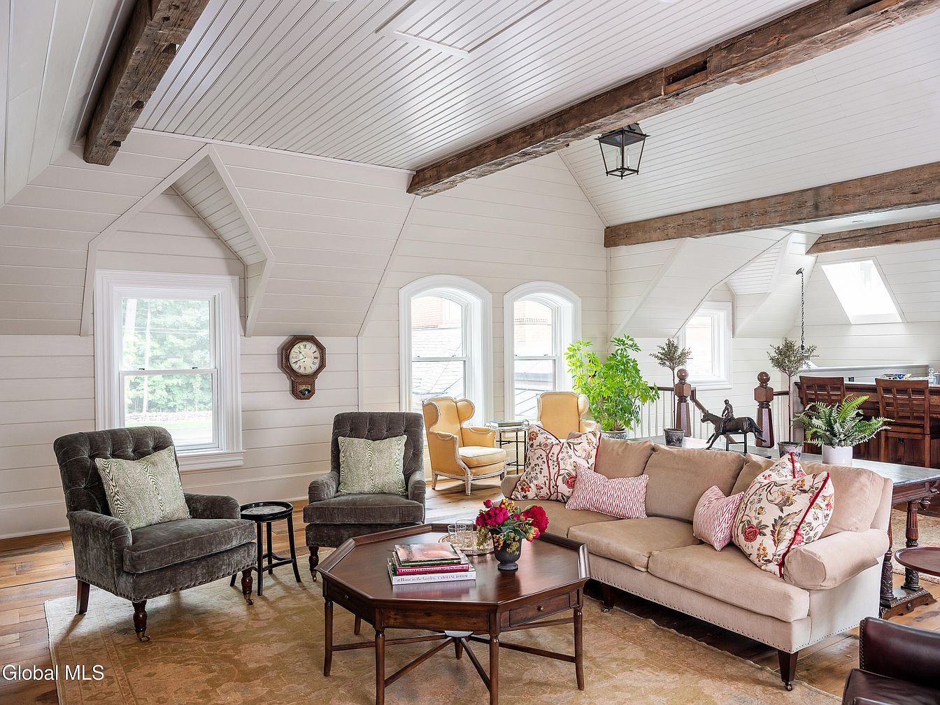 A spacious living room with a vaulted, beadboard ceiling accented by exposed wooden beams, creating a warm and welcoming ambiance. The neutral color palette of cream walls and ceiling is balanced by earthy tones in the plush area rug and beige sofa. Large windows and dormers let in generous natural light, brightening the space and providing scenic views. The seating area features a mix of comfortable armchairs and a sofa adorned with floral and geometric cushions, perfect for family gatherings. Classic details include a vintage octagonal clock, wooden coffee table, and indoor plants for a fresh, homey touch. The open layout encourages conversation and relaxation.