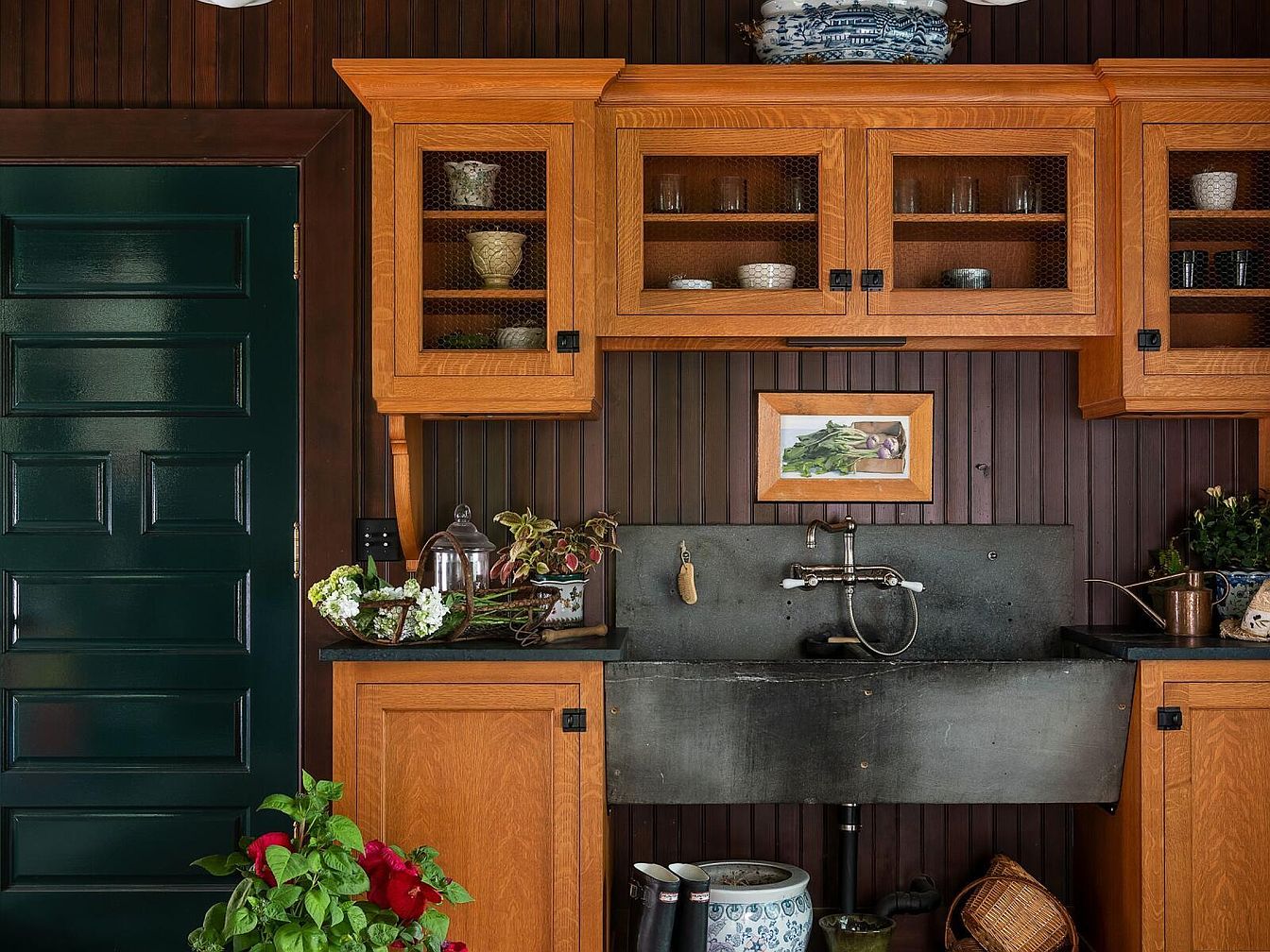 This charming mudroom features warm wood cabinetry with classic glass pane doors and black hardware, set against rich, vertical paneled walls. A deep farmhouse sink with a vintage wall-mounted faucet serves as a practical spot for rinsing boots, watering plants, or cleaning up after outdoor activities, making it ideal for busy families. The dark green door adds a bold touch, complementing the nature-inspired accents and fresh potted flowers on the counters. Artful touches like a framed vegetable print and decorative pottery create a cozy, welcoming atmosphere, while the ample storage above and below keeps the space organized for everyday family life.
