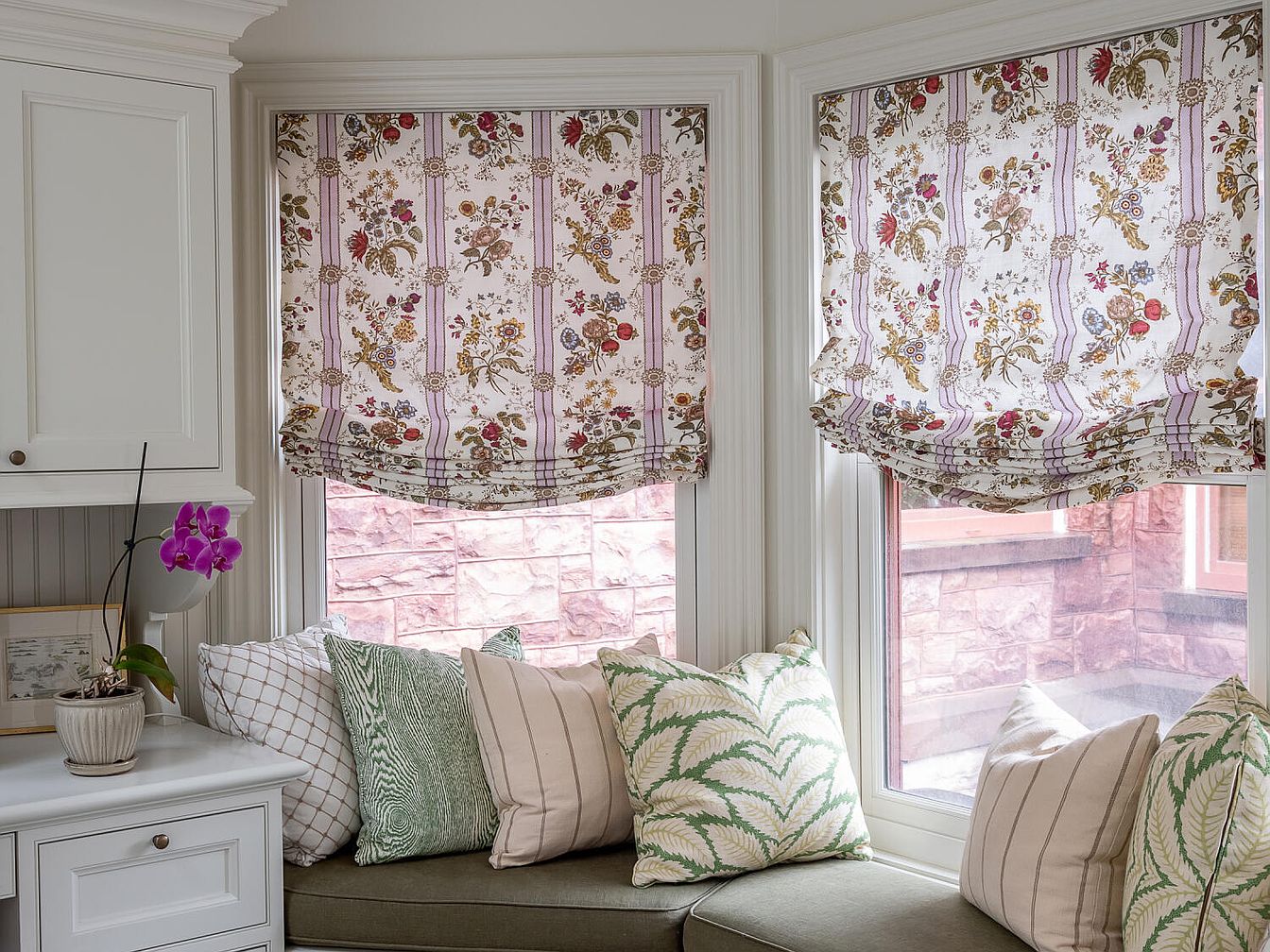 A cozy breakfast nook is nestled in a bright corner, framed by large windows dressed in charming floral Roman shades that fill the space with a soft, inviting light. The built-in bench is topped with a plush olive-green cushion and an array of throw pillows in calming green and cream patterns, offering both comfort and a touch of playful style. Crisp white cabinetry beside the seat adds functional storage and a tidy feel, while a potted orchid brings a lively pop of color. The intimate setting is perfect for family gatherings, quiet reading, or enjoying a morning coffee together.