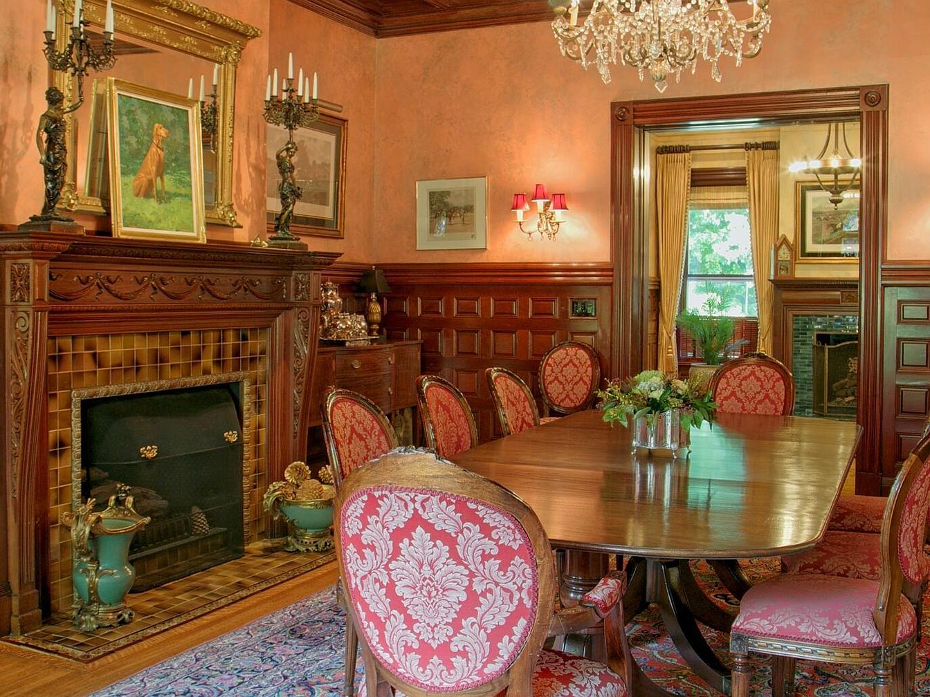 A classic dining room exudes warmth and refinement, featuring rich wooden wainscoting and an intricately carved fireplace mantle topped with gilded frames and artwork. Elegant, floral-upholstered chairs surround a polished wooden table, providing ample seating for family gatherings and entertaining guests. A dazzling crystal chandelier hangs above, offering a touch of luxury and brilliant illumination. Muted rose walls and ornate light fixtures create a cozy, inviting ambiance. The well-appointed layout ensures plenty of space for children and adults alike, while wide doorways connect seamlessly to adjacent rooms, promoting an open, family-friendly atmosphere ideal for memorable shared meals.