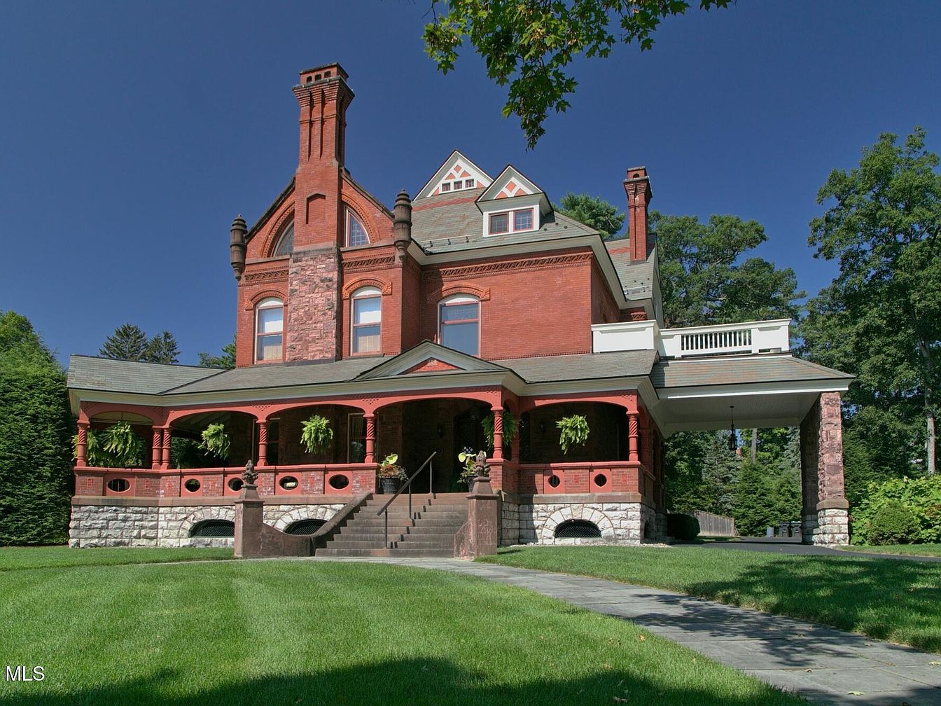 An impressive American home showcases Victorian-inspired architecture with stately red brickwork, ornate chimneys, and detailed trim. The expansive covered wraparound porch, accented by decorative columns and lush hanging ferns, hints at warm summer gatherings and family relaxation. Large windows welcome natural light inside, while the broad driveway and attached portico offer convenient, protected parking. The front lawn, perfectly manicured and bordered by mature trees, provides ample play space for children and pets. Intricate stonework along the foundation adds to the grandeur, making this home both inviting and timeless, ideal for family life and entertaining friends.