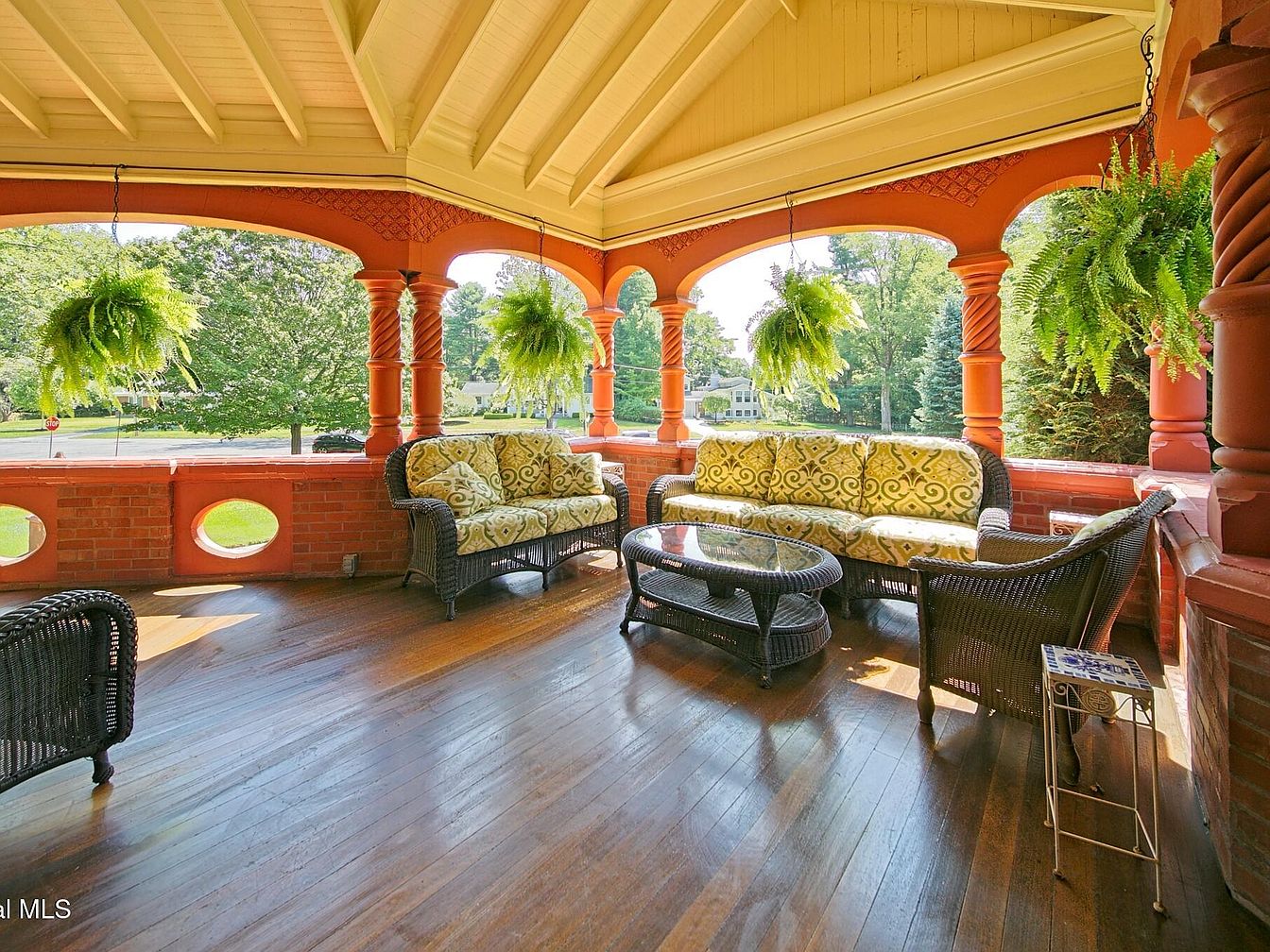 A spacious, covered front porch welcomes family and guests with warm red brick columns, intricate detailing, and sweeping arches. The inviting seating area features wicker furniture with plush, patterned cushions arranged for conversation and relaxation. Natural wood floors add a classic touch, while hanging ferns bring a vibrant, fresh energy to the space. The porch is designed for comfort, ideal for family gatherings, quiet afternoons, or children’s play. Light streams in through open arches, creating a bright, airy atmosphere with beautiful views of the lawn and mature trees, making this a perfect retreat for all ages.