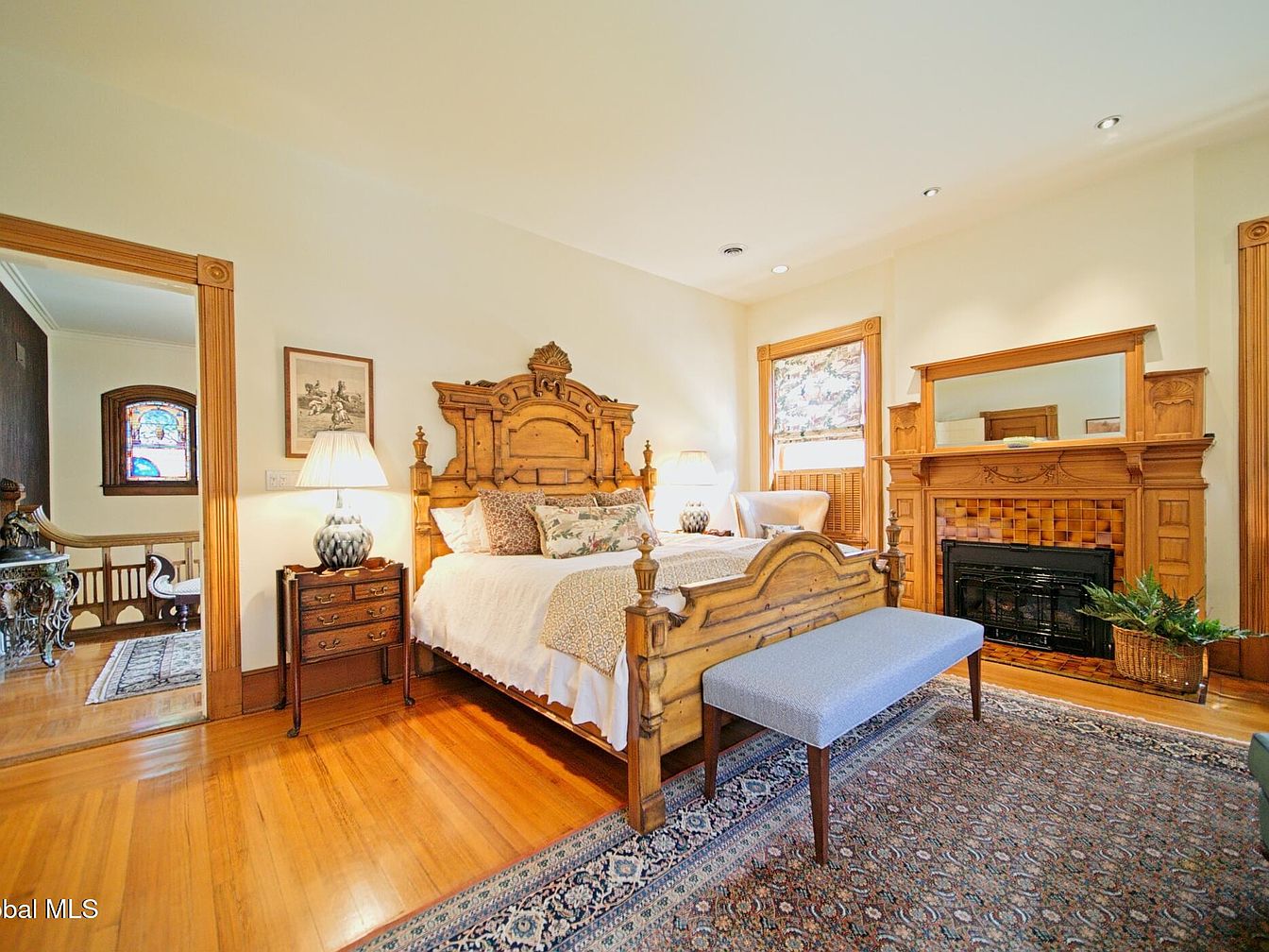 Spacious and inviting, this master bedroom features warm hardwood floors and abundant natural light, enhanced by creamy walls and wood-trimmed windows. An intricately carved wooden bed serves as the focal point, paired with coordinating bedside tables and elegant lamps for a timeless charm. A cozy bench at the foot of the bed adds extra comfort, while an ornate fireplace with detailed woodwork and a large framed mirror brings architectural distinction. The soft area rug underfoot offers a touch of plushness and pattern. This tranquil retreat is ideal for families, fostering relaxation and togetherness in a beautifully designed setting.