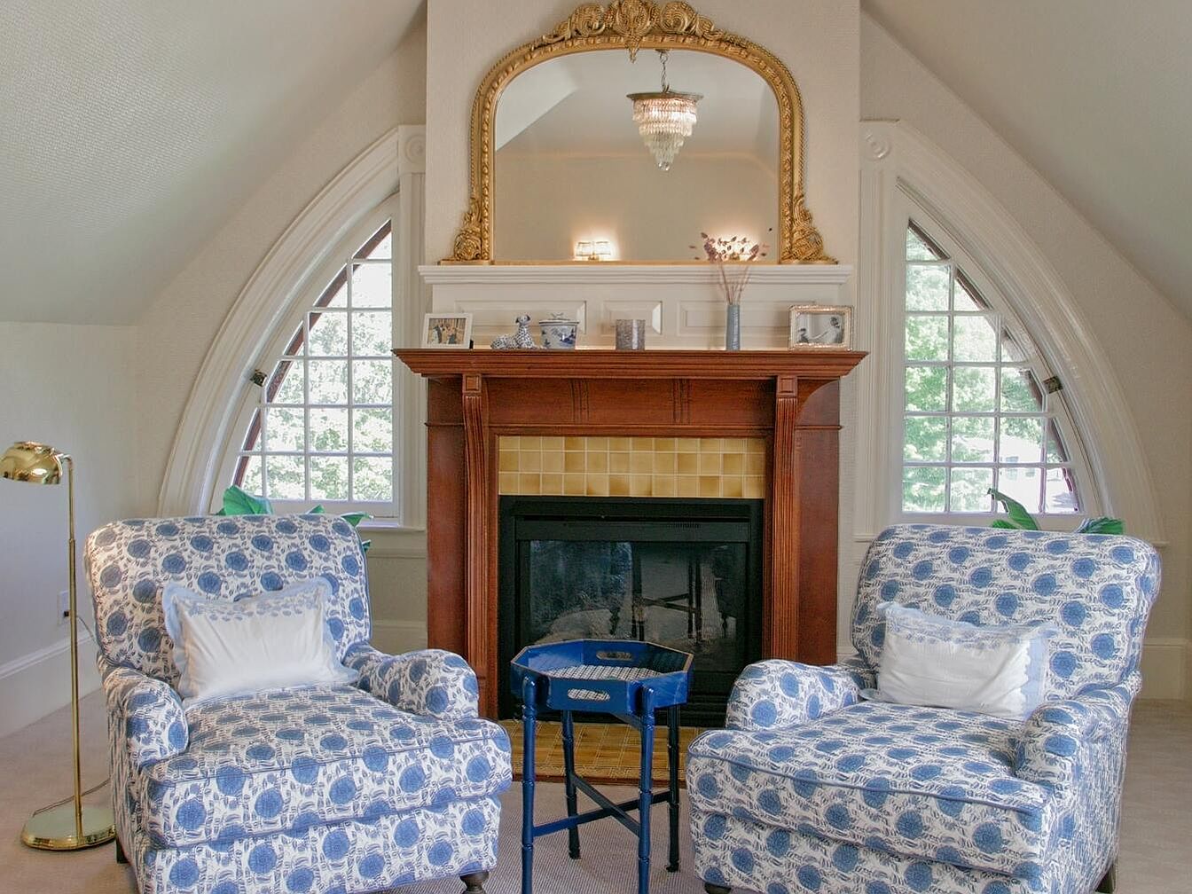 A cozy sitting area features two plush armchairs adorned in a blue and white floral print, arranged to encourage conversation or quiet reading by the fireplace. The fireplace anchors the room with a classic wooden mantel and pale yellow tile accents, topped with a dramatic gold-framed mirror and personal decor, adding a touch of elegance. Arched windows on either side flood the space with natural light, enhancing the soft neutral walls and carpet. A small blue side table rests conveniently between the chairs, while a gold reading lamp adds warmth. The room’s inviting layout makes it perfect for family gatherings or relaxing moments.