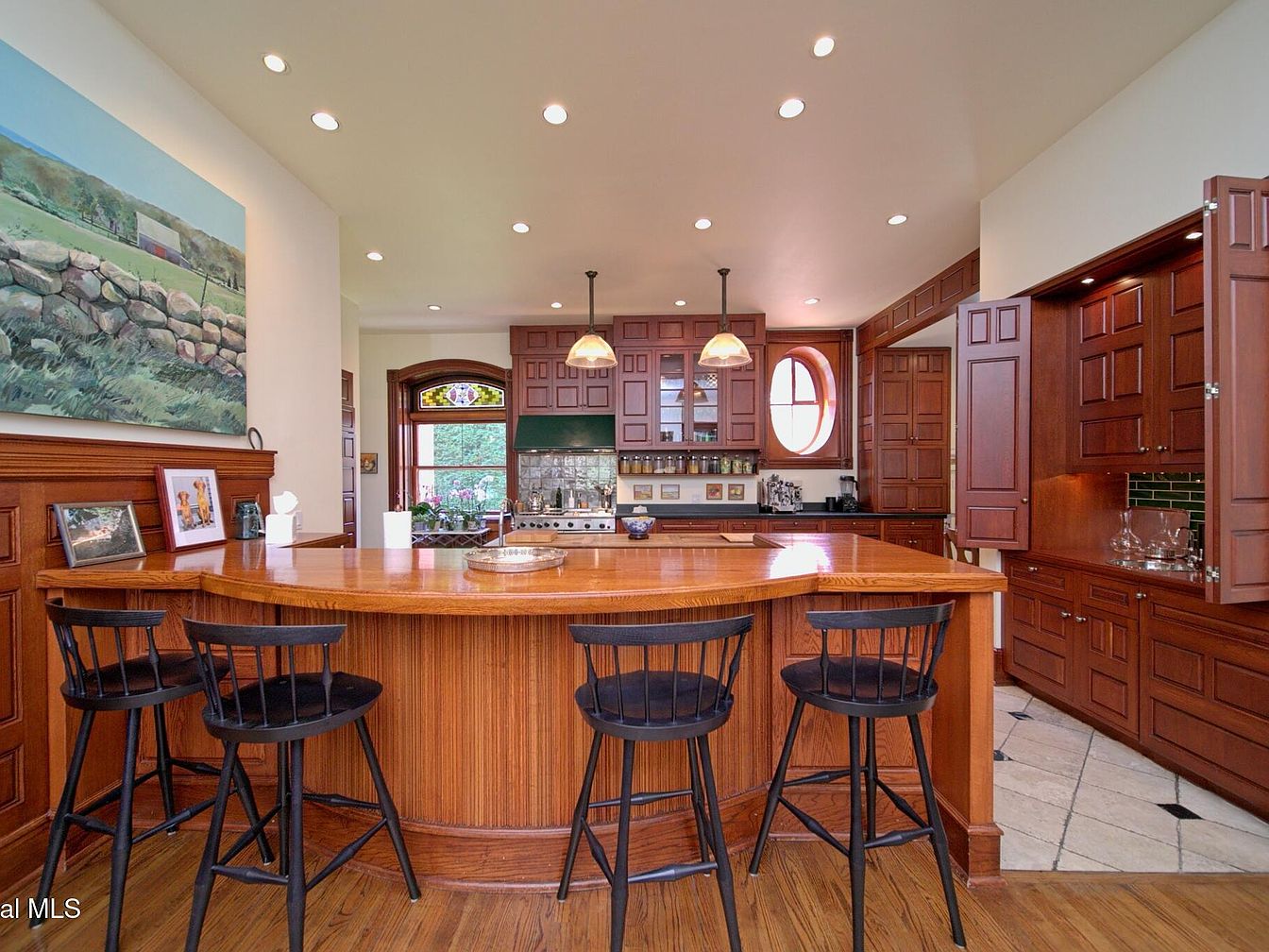 Warm wood cabinetry, paneling, and a spacious breakfast bar set the tone for this inviting kitchen designed for family gatherings and lively conversations. The curved bar features black spindle-back stools and provides ample counter space, perfect for casual meals or helping children with homework. Elegant pendant lighting, detailed cabinetry with inset panel doors, and a striking round window add character and architectural charm. A large range and abundant storage make cooking for a family easy, while decorative touches like framed art and a landscape painting personalize the space. The harmonious mix of natural wood, soft lighting, and practical layout balances sophistication and livability.