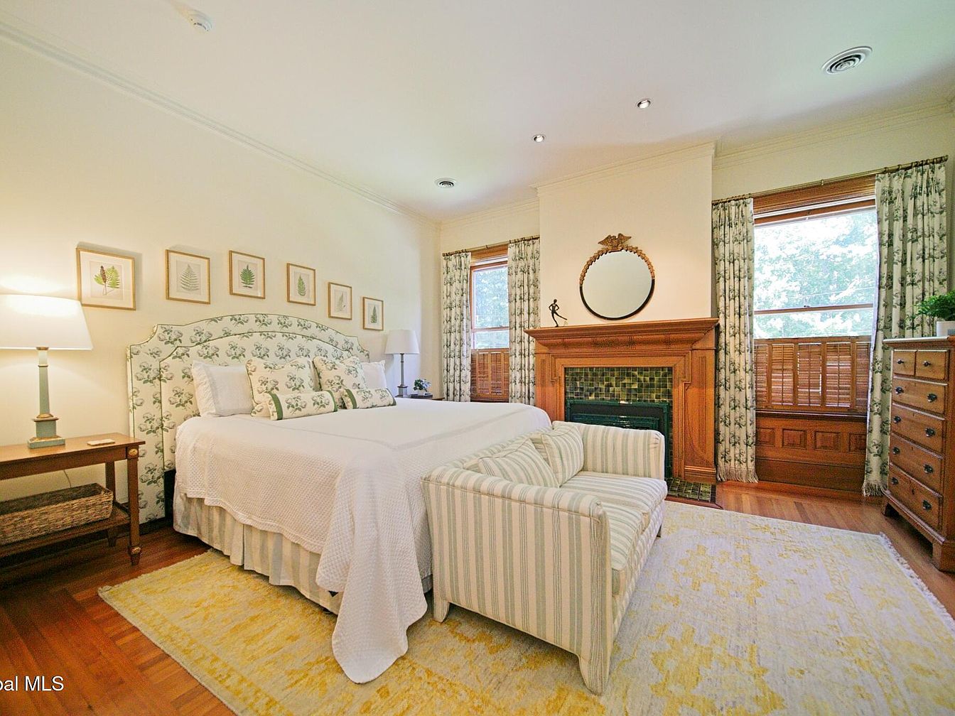 This spacious primary bedroom blends classic charm with a cozy, family-friendly ambiance. Soft cream walls are accented by botanical prints above a king-sized bed, which features a floral-upholstered headboard and coordinated pillows. A comfortable striped settee sits at the foot of the bed, perfect for relaxing or story time with children. The original wood fireplace with artisan tilework and built-in mantle provides warmth and character, flanked by tall windows that allow natural light to brighten the room. Coordinating drapery, hardwood floors, and a pale yellow area rug add to the inviting, restful atmosphere, making this bedroom ideal for peaceful family moments.