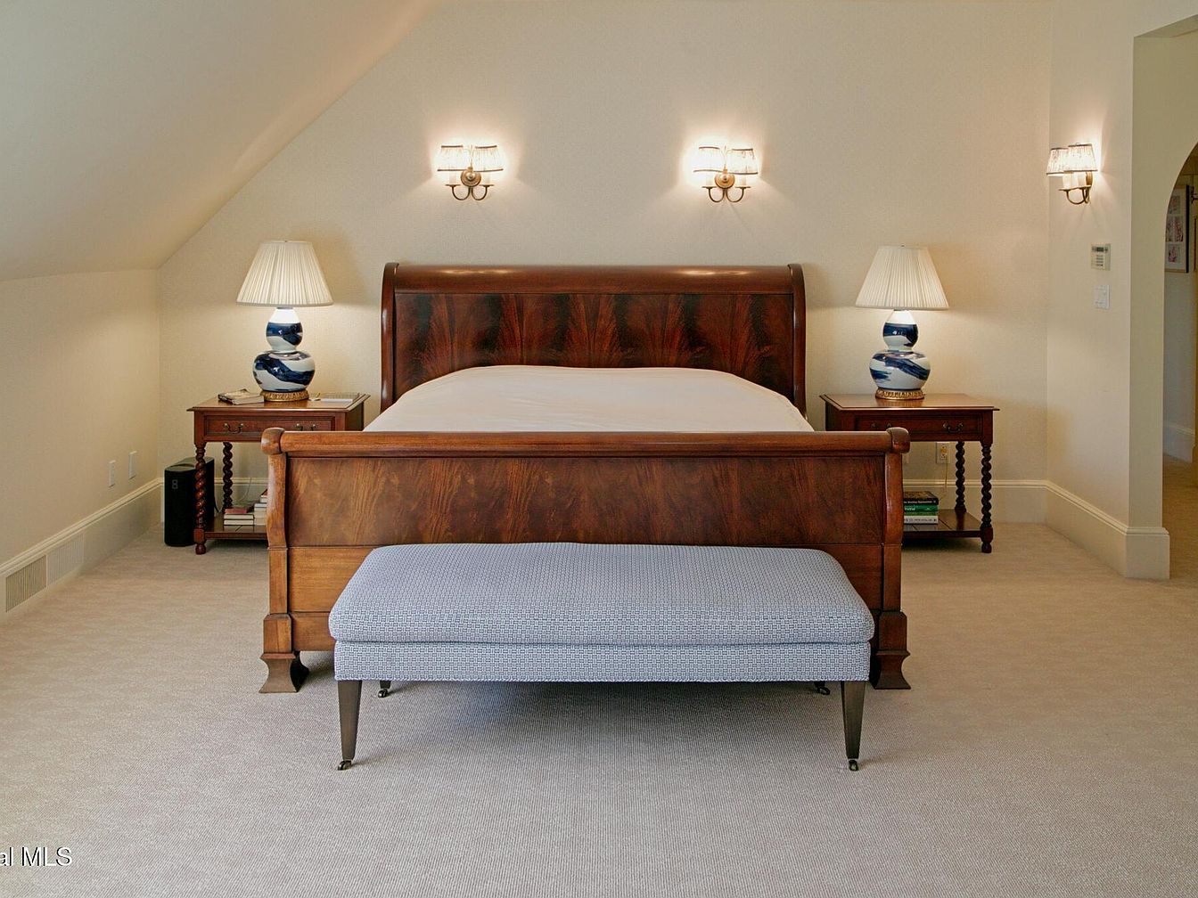 A spacious bedroom features a classic sleigh bed crafted from rich wood, set against soft cream-colored walls that reflect the natural light. Flanking the bed, matching nightstands each support a unique blue-and-white ceramic lamp, adding elegance and symmetry. Wall sconces provide gentle, ambient lighting, perfect for relaxation. The plush, light-toned carpet creates a cozy environment ideal for families. An upholstered bench at the foot of the bed offers additional seating or a convenient space for children. Subtle arched entryways and carefully chosen furniture create a sophisticated atmosphere while maintaining comfort and functionality for everyday living.