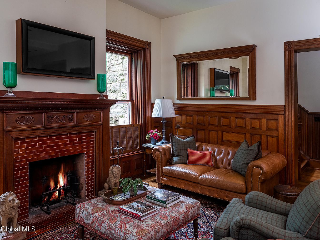 Warmth and character define this inviting living room, which features rich wood paneling, intricate fireplace mantels, and decorative trim framing the windows and doorways. A classic Chesterfield leather sofa and plaid armchairs offer timeless comfort, while soft accent pillows and a patterned ottoman provide a relaxed spot for family gatherings. The brick fireplace with vibrant flames creates a welcoming, cozy atmosphere, perfect for storytime or enjoying a movie night on the wall-mounted television above. Vibrant green glass vases and fresh flowers add a touch of color, while the large wall mirror and ample natural light keep the space open and bright.