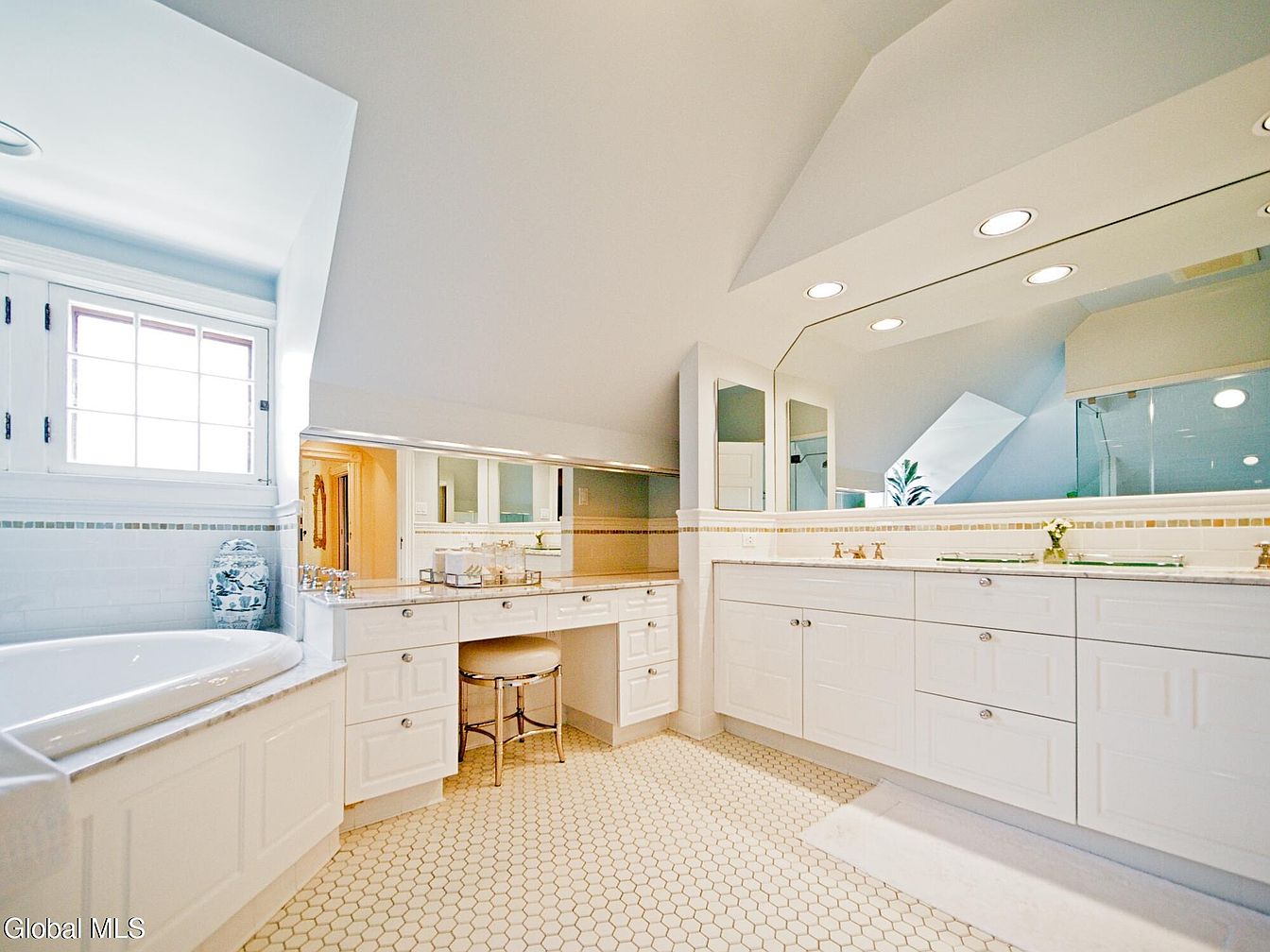 Bright and spacious, this bathroom vanity suite radiates classic charm with its all-white cabinetry and elegant marble countertops. The room’s layout includes a large soaking tub tucked by a window, a generous double-sink vanity with custom mirrors, and a dedicated makeup station with a cushioned stool for added convenience. Recessed lighting illuminates the space, enhancing the clean aesthetic and open feel. Hexagonal tile flooring complements the refined look, while built-in storage provides family-friendly organization for a neat and orderly environment. Subtle accents and a serene neutral palette contribute to a calming atmosphere ideal for daily routines.