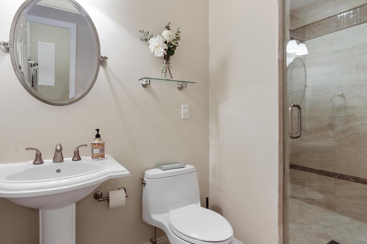 A well-appointed bathroom showcases a modern pedestal sink paired with a sleek, round mirror and brushed nickel fixtures, which add a touch of elegance. Soft beige walls create a calming atmosphere, while a glass shelf with a minimalist floral arrangement adds a warm, personal touch. The toilet’s simple, clean lines complement the overall tidy aesthetic. A spacious walk-in shower with glass doors and natural stone tile is visible, making the space easily accessible and family friendly. The bright, neutral color scheme and uncluttered design encourage relaxation, ease of cleaning, and suit a variety of family needs and tastes.