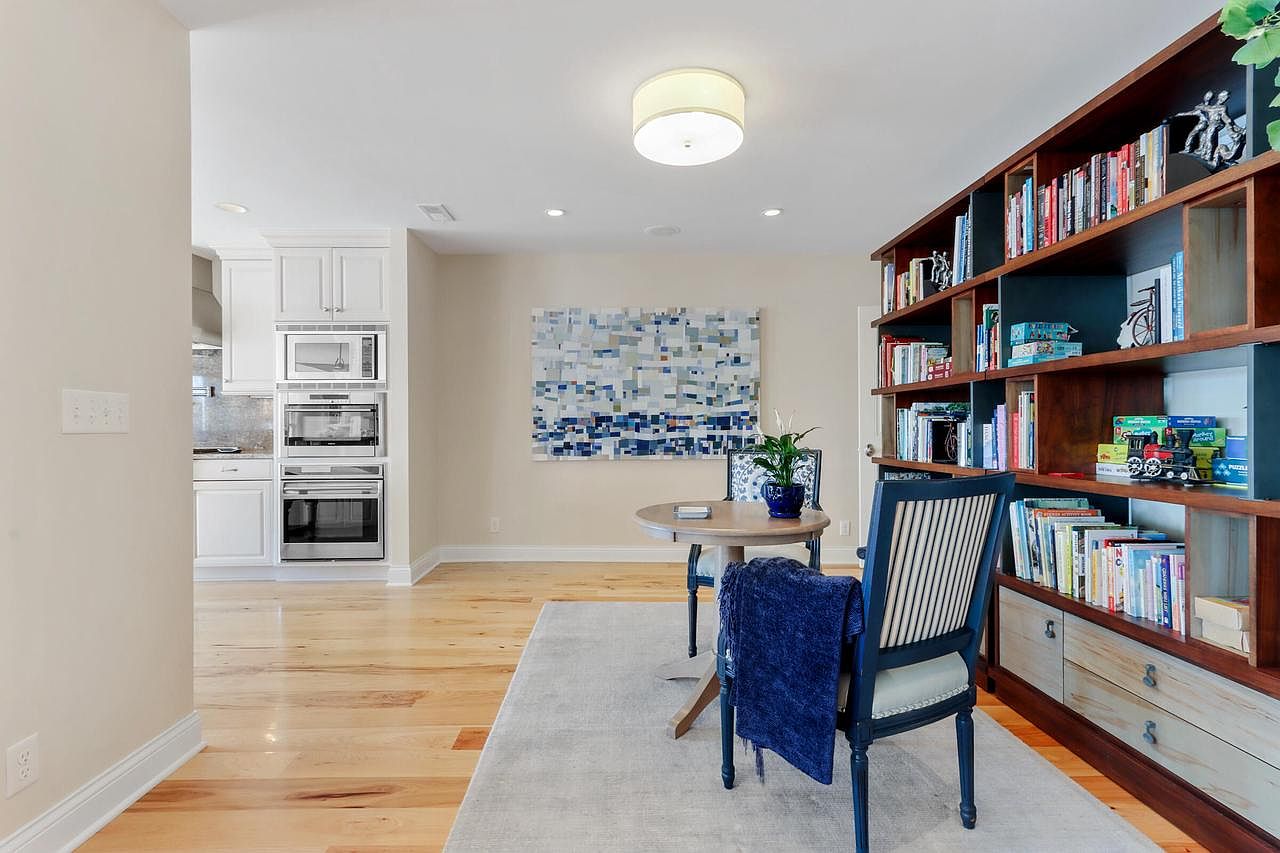 A bright and inviting reading nook seamlessly opens to the kitchen, combining function with elegance for all ages. The space features a large wooden bookshelf filled with books and educational games, making it a welcoming spot for both children and adults to gather and read together. Light hardwood floors and creamy walls create a warm, airy ambiance. A round wooden table and upholstered chairs encourage family interaction, while a soft area rug defines the cozy seating area. A modern abstract painting in blue tones adds a splash of color and visual interest. This layout encourages learning, creativity, and family bonding.
