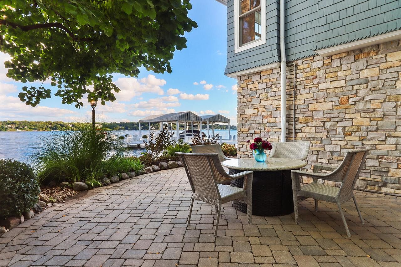 A tranquil lakefront patio invites relaxation and togetherness, featuring a round outdoor dining table with comfortable woven chairs set atop stone pavers. The patio is bordered by a natural stone wall, blending rustic charm with modern appeal, and shaded by mature trees that create a cool, inviting space ideal for family gatherings. Lush landscaping with ornamental grasses and low shrubs lines the perimeter, softening the transition to the waterfront. Light blue and soft beige hues from the home’s exterior enhance the serene, airy vibe, making this an ideal spot for alfresco meals or lakeside sunrise coffees with loved ones.