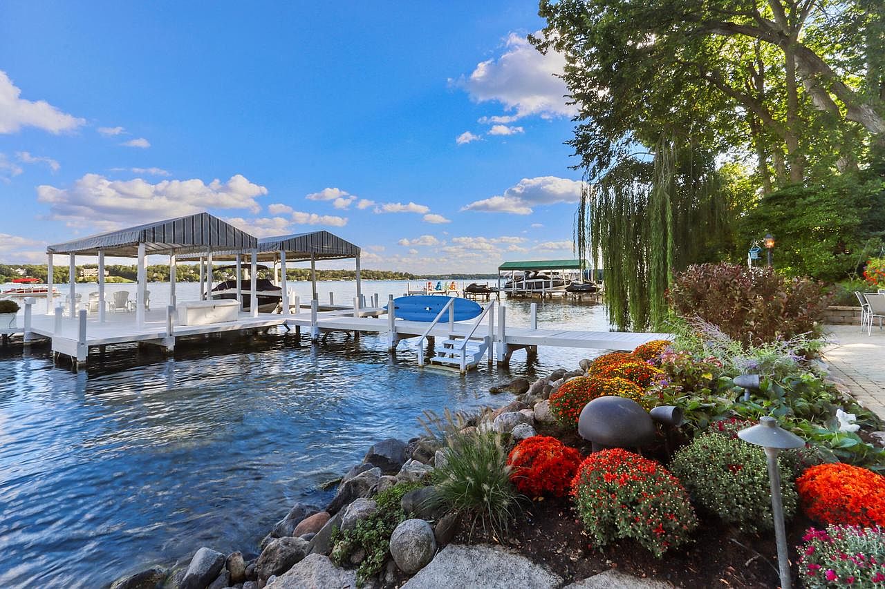 A beautifully designed lakeside dock extends over calm water, featuring covered boat slips and a sitting area perfect for family gatherings or tranquil relaxation. The dock’s crisp white structure contrasts elegantly with the blue lake, creating a refreshing and inviting atmosphere. The shoreline is adorned with lush landscaping; vibrant red, orange, and green plants and meticulously arranged stones deliver a charming, natural look. Spacious paved walkways lead from the garden to the dock, making it safely accessible for all ages. Large mature trees provide shade, while a willow tree adds a whimsical touch, encouraging outdoor family activities year-round.