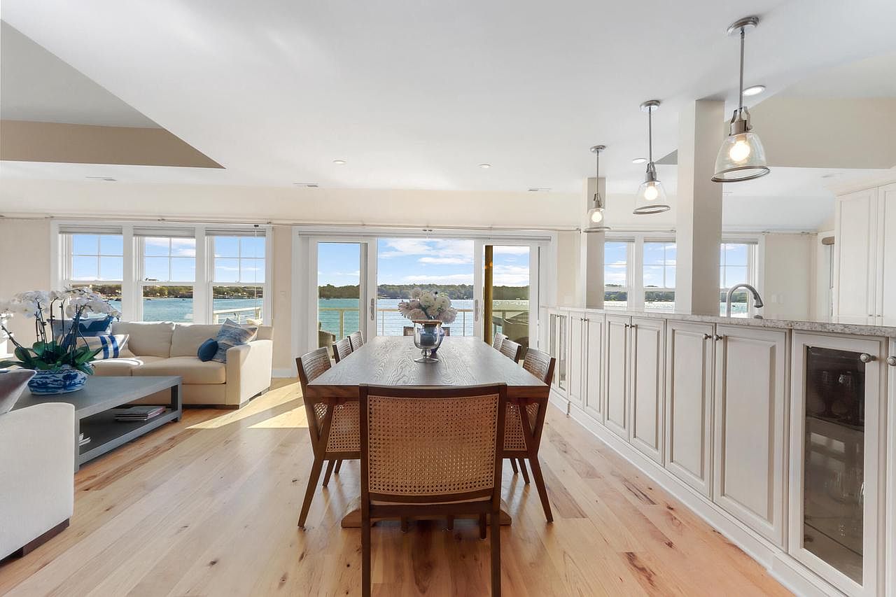 Bright and airy, this open-concept dining area merges seamlessly with a cozy living space, bathed in natural light from large windows and glass doors facing a scenic water view. The natural wood dining table and woven-backed chairs anchor the room, while soft neutral tones in cabinets and hardwood floors create a timeless backdrop. Family-friendly features include a spacious layout for easy movement, a large comfortable sectional sofa for gatherings, and sturdy, easy-to-clean finishes. Pendant lights above the kitchen counter add a modern touch, and soft blue accents echo the serene outdoor setting, enhancing the inviting, relaxed atmosphere.