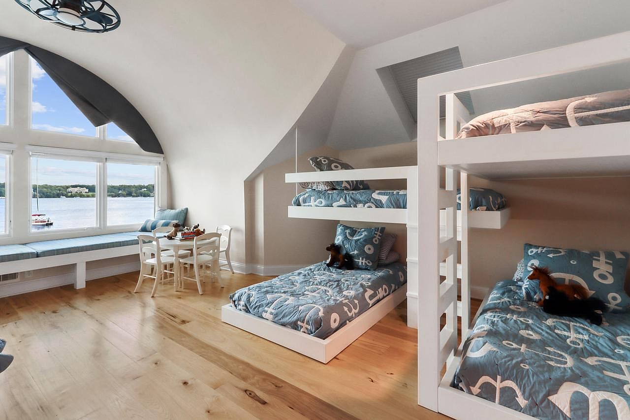 A spacious kid’s bedroom designed with a playful yet practical touch, featuring custom white triple bunk beds perfect for sleepovers or siblings. Nautical-themed blue bedding with anchor prints adds a charming, coastal vibe while maintaining a fun, child-friendly atmosphere. Wide-plank wood floors offer durability and warmth, ideal for family living. A cozy built-in window bench provides the perfect spot for reading or gazing at the lakeside view, while a petite table and chairs encourage group activities. Vaulted ceilings and expansive windows fill the room with natural light, creating an airy and inviting retreat for children of all ages.