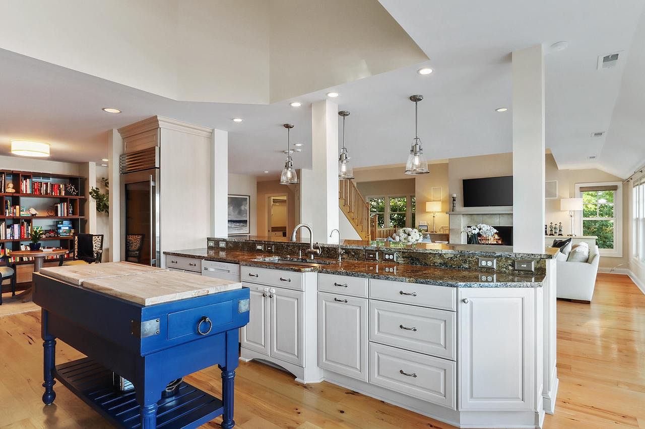 An inviting open-concept kitchen flows seamlessly into the living and dining areas, making it ideal for family gatherings and entertaining. The centerpiece is a spacious kitchen island with a granite countertop and an eye-catching blue butcher block table, blending modern and traditional elements. Crisp white cabinetry and polished wood floors create a fresh and welcoming atmosphere. Pendant lighting above the island provides a contemporary touch, while the adjoining living space features comfortable seating and a fireplace, perfect for cozy evenings. Large windows welcome natural light, and a nearby bookshelf adds a family-friendly spot for study or relaxation.